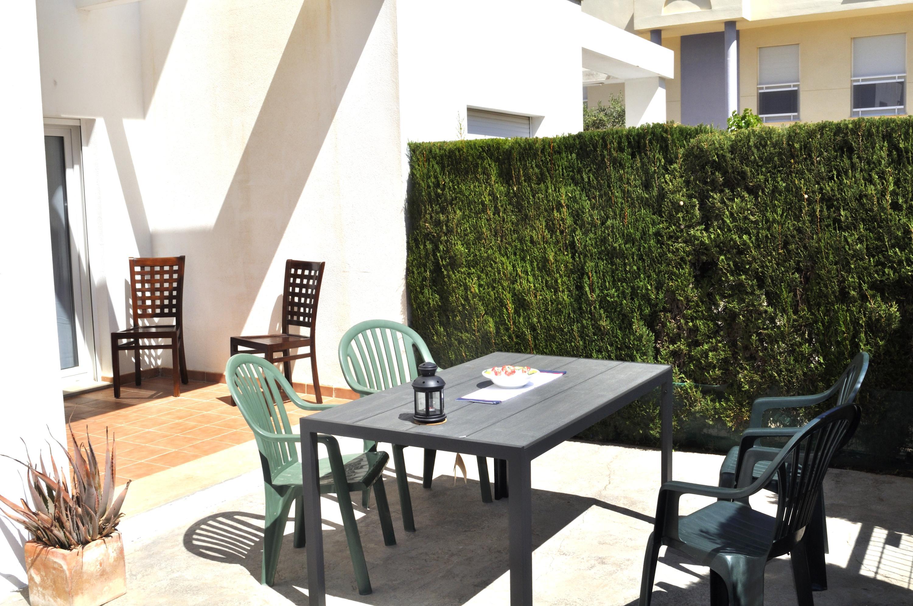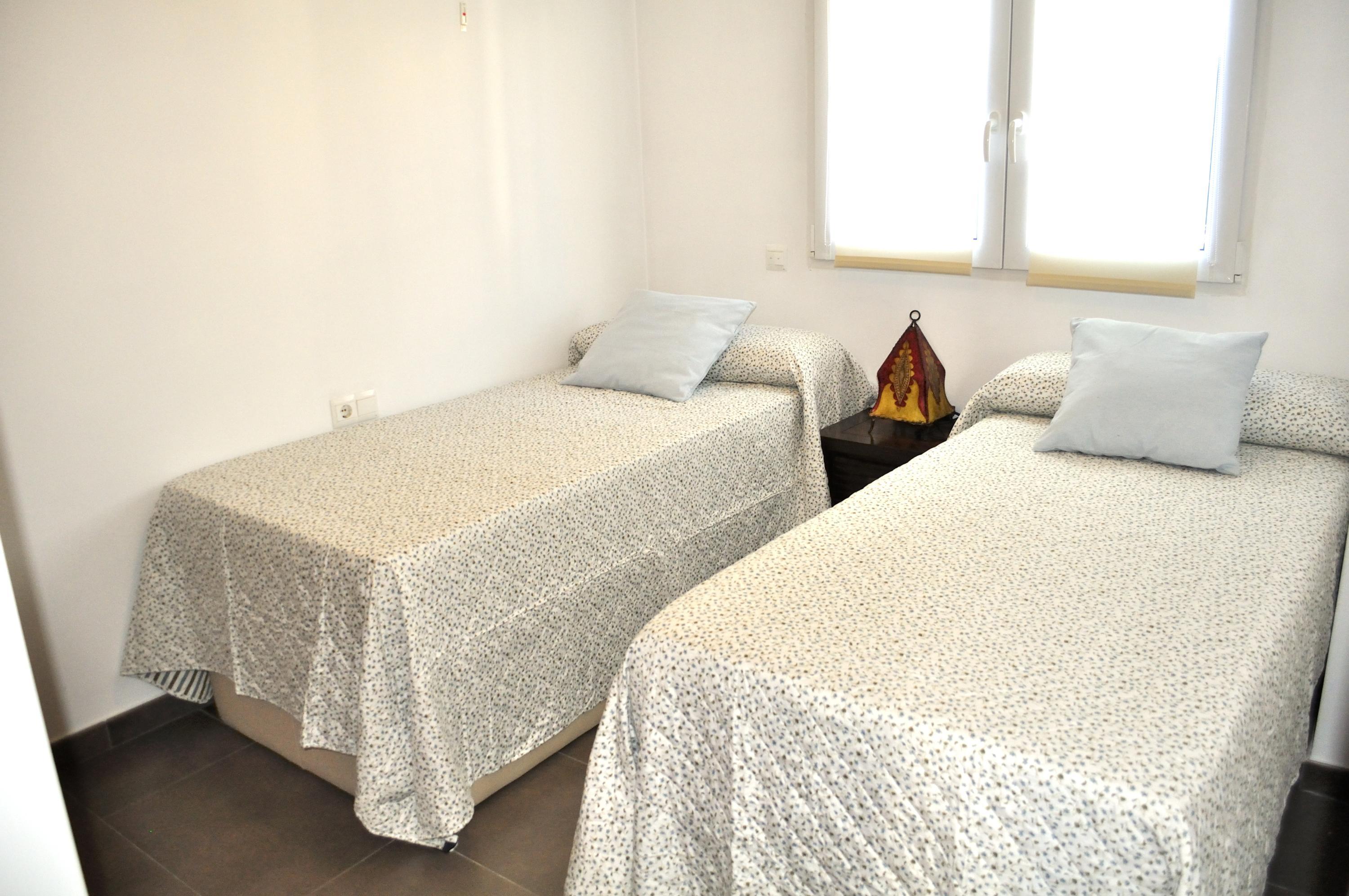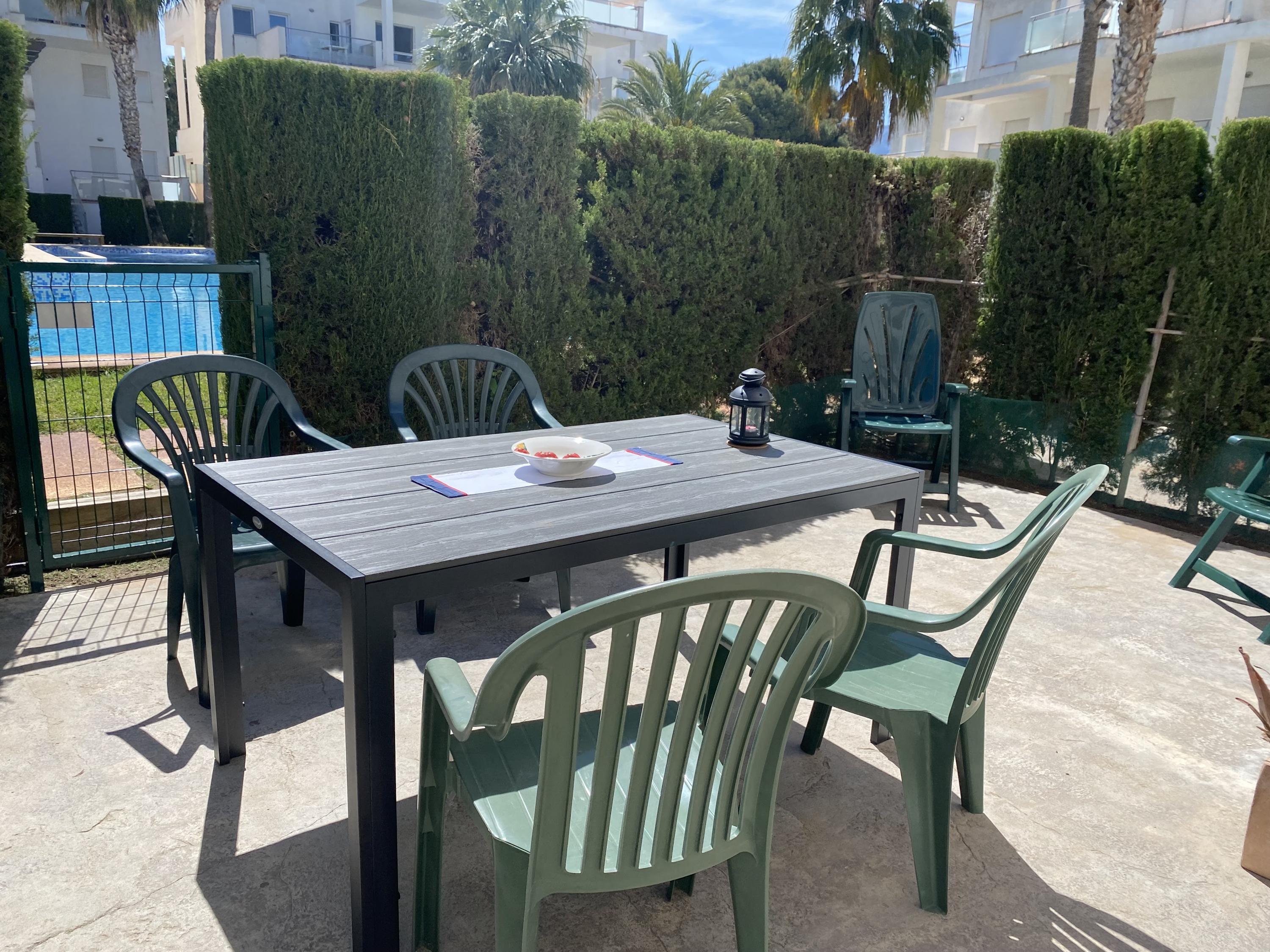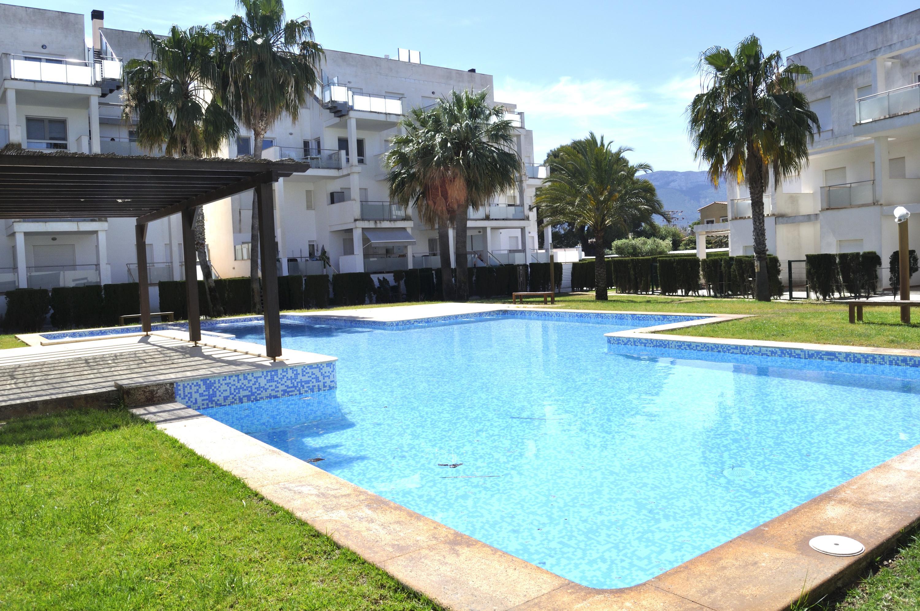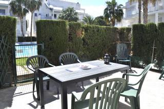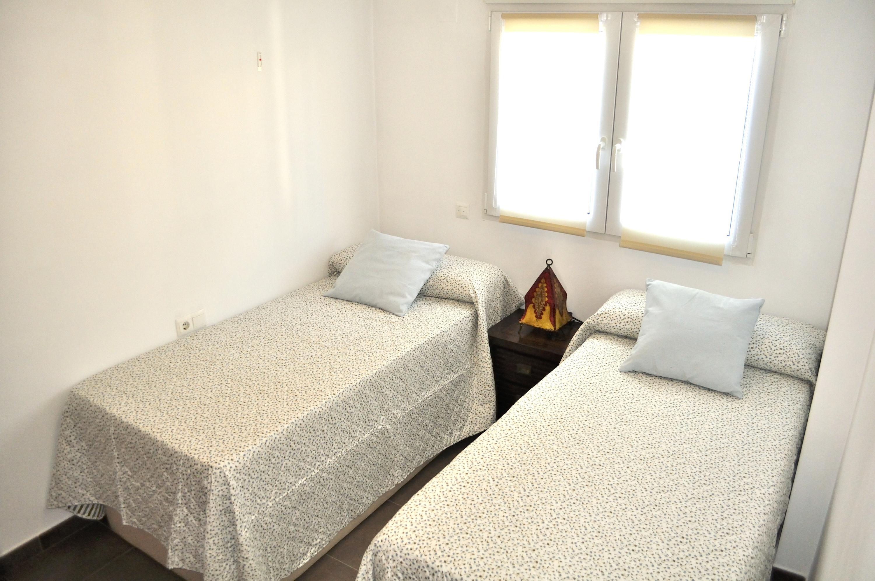Sunny ground floor, with two bedrooms, one with double bed and the other with two single beds, bathroom with shower. Open fitted kitchen, washing machine. It has two terrace an exit from the sunny lounge in the mornings, and another rear terrraza with access from the kitchen, with sun in the afternoon. The apartment is in an urbanization, with communal pool, garden, and has a parking space sitting inside. 500 m from the beach and 1 km from the port of Denia