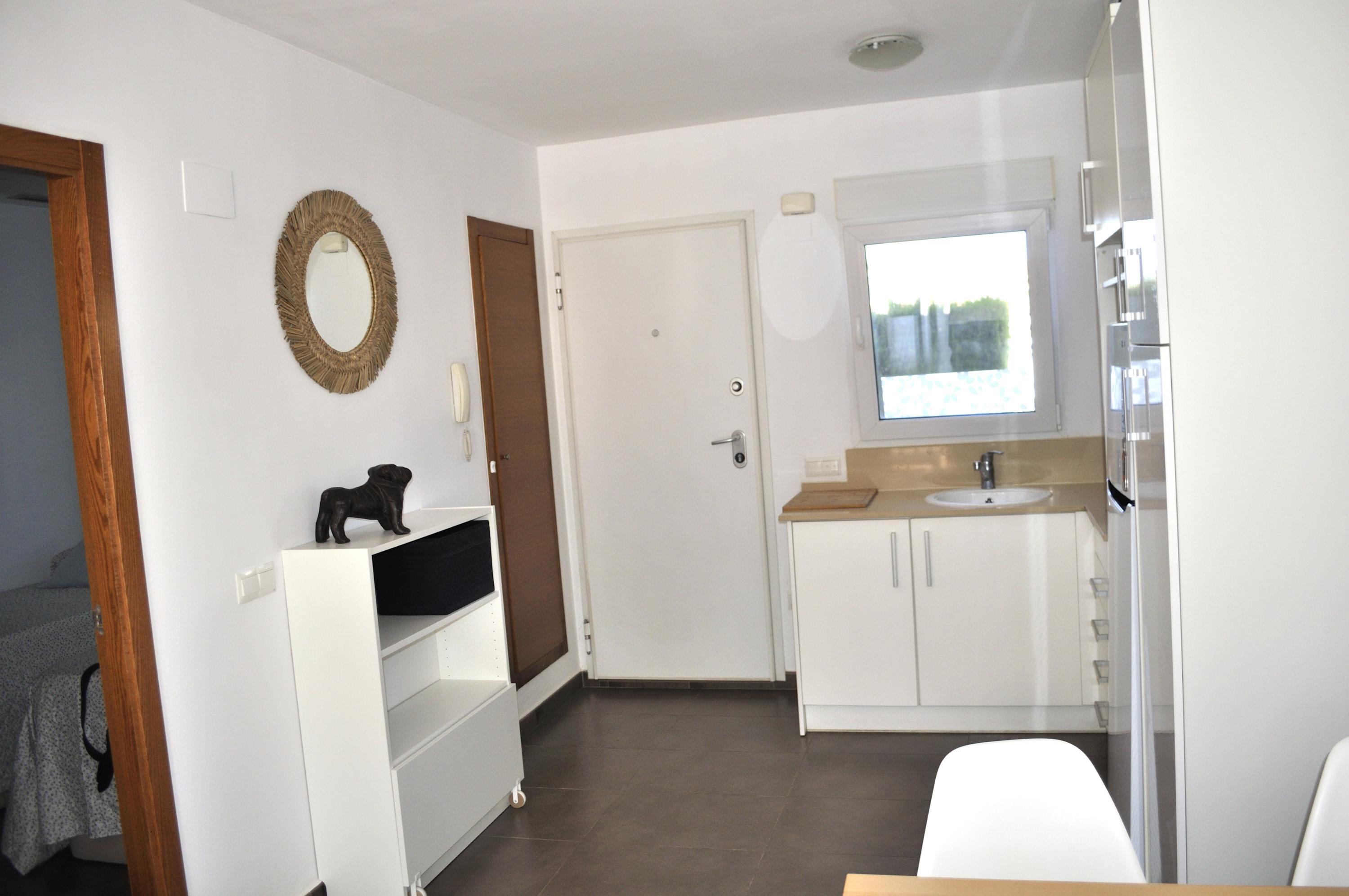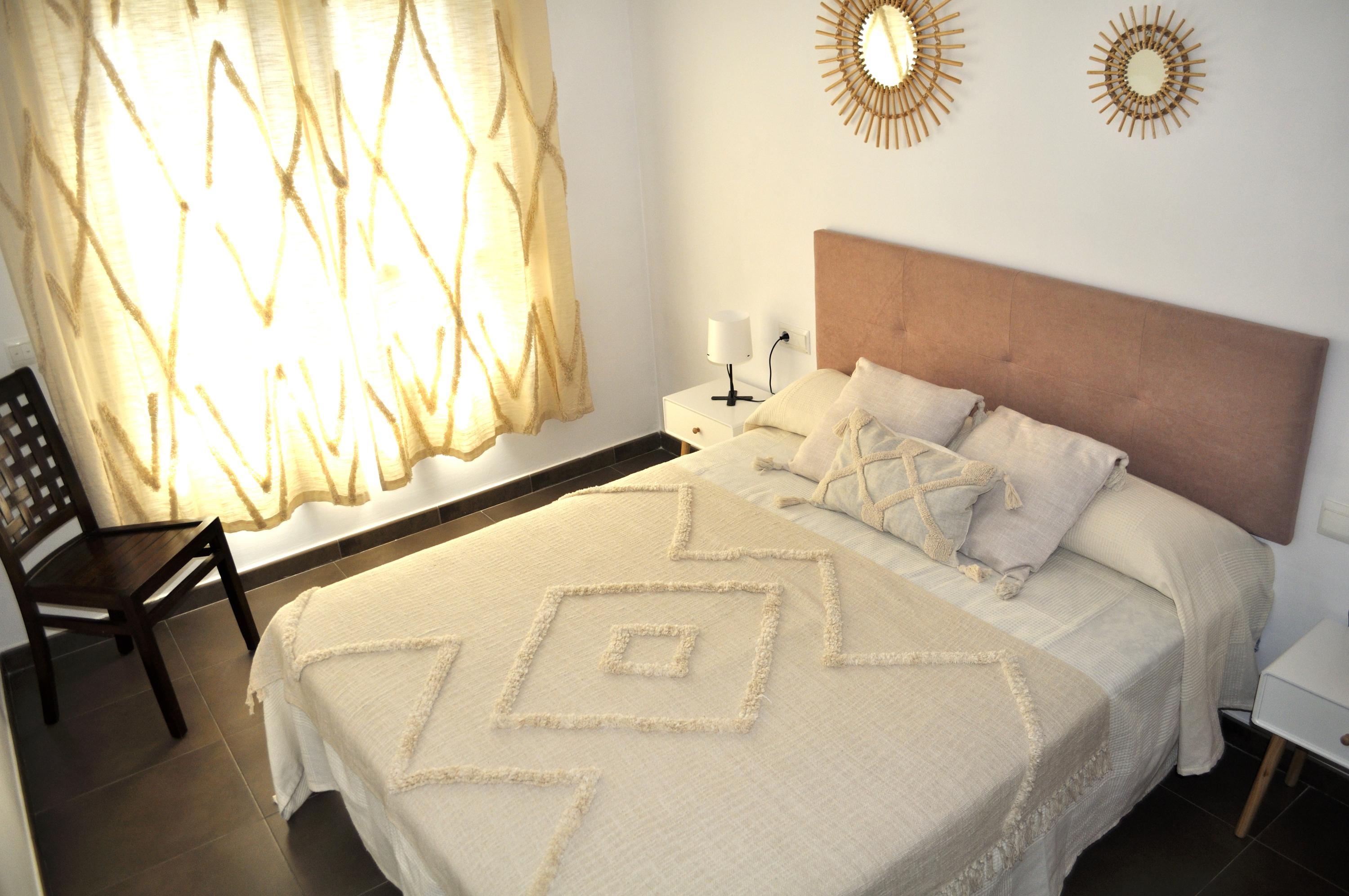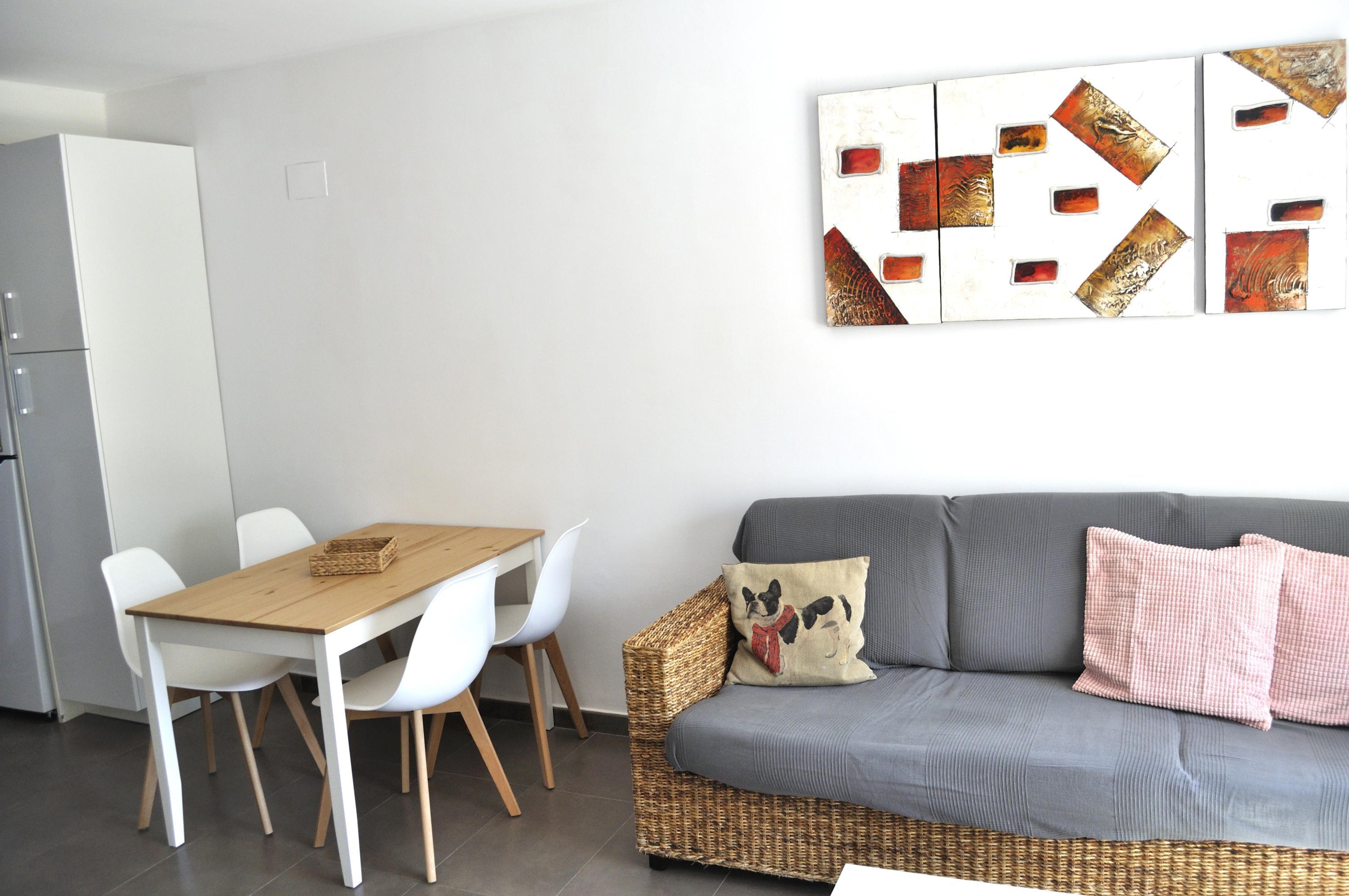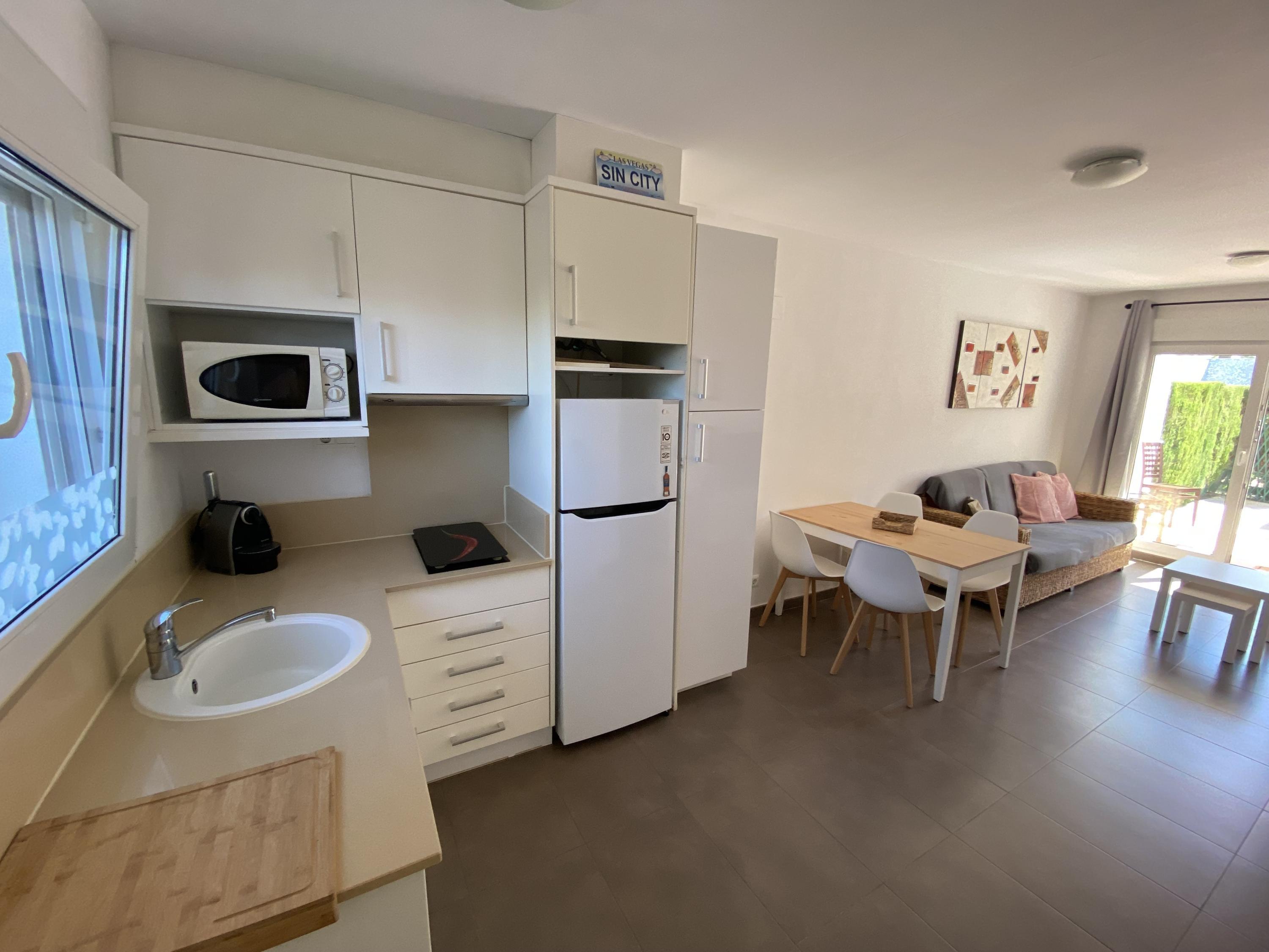 Sunny ground floor, with two bedrooms, one with double bed and the other with two single beds, bathroom with shower. Open fitted kitchen, washing machine. It has two terrace an exit from the sunny lounge in the mornings, and another rear terrraza with access from the kitchen, with sun in the afternoon. The apartment is in an urbanization, with communal pool, garden, and has a parking space sitting inside. 500 m from the beach and 1 km from the port of Denia