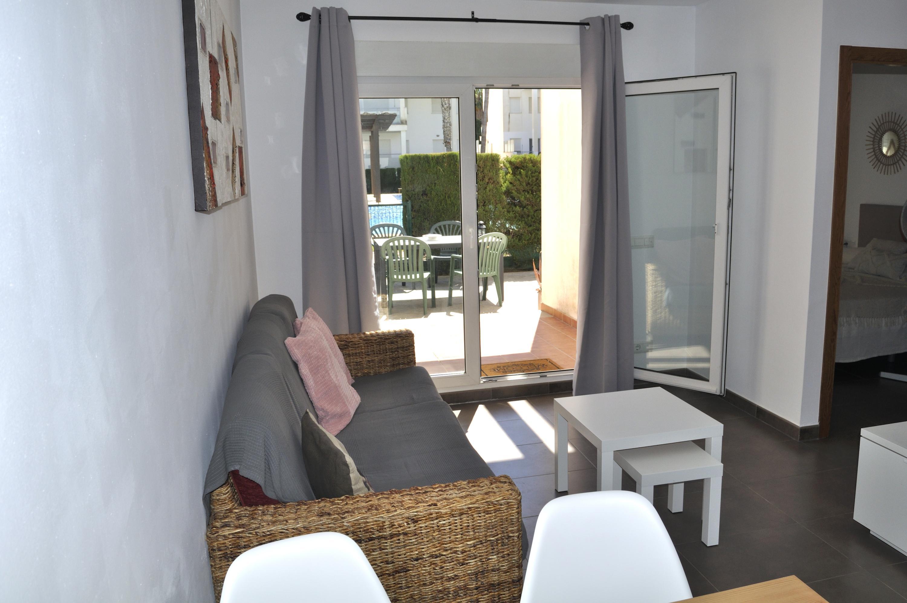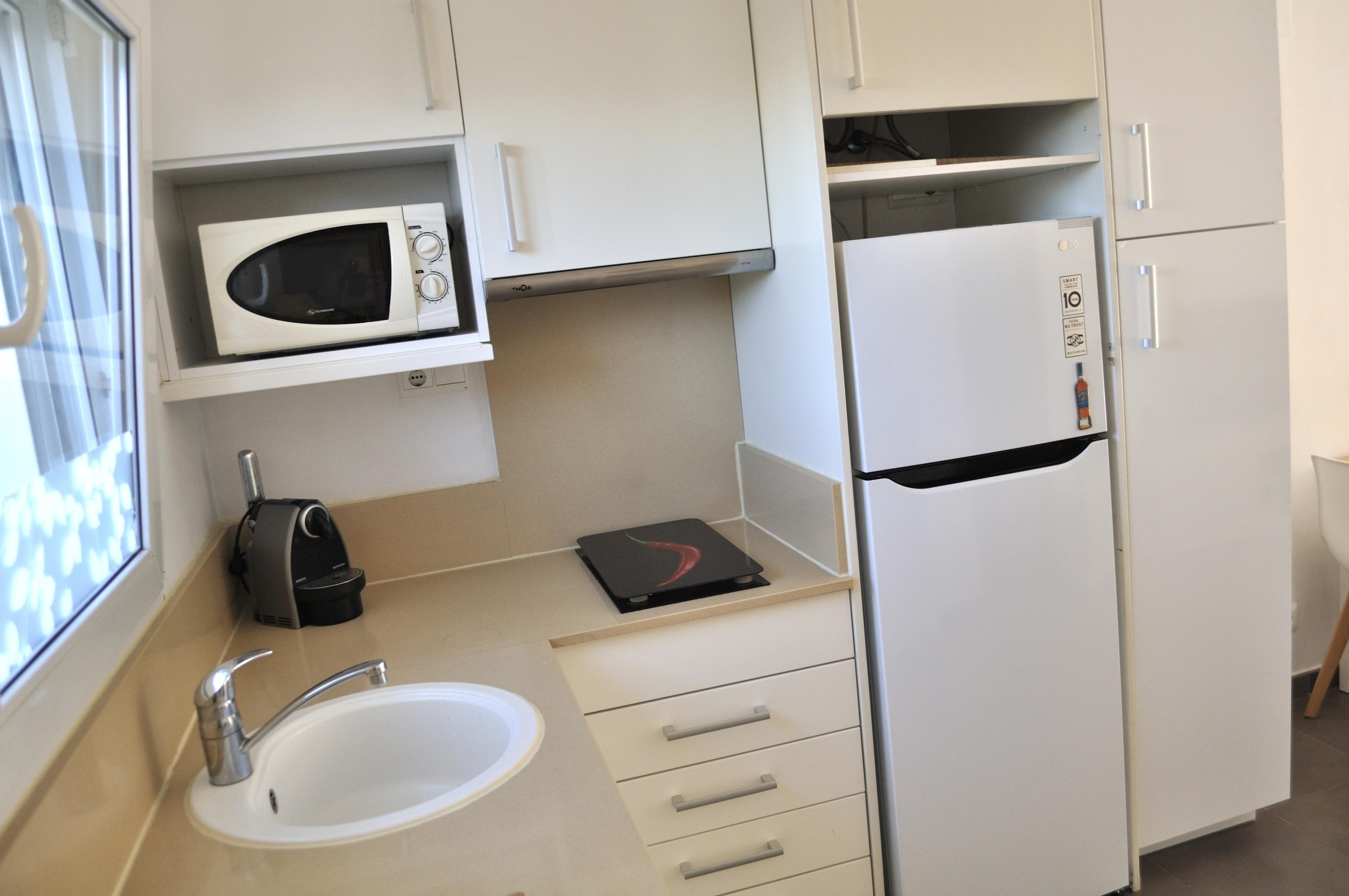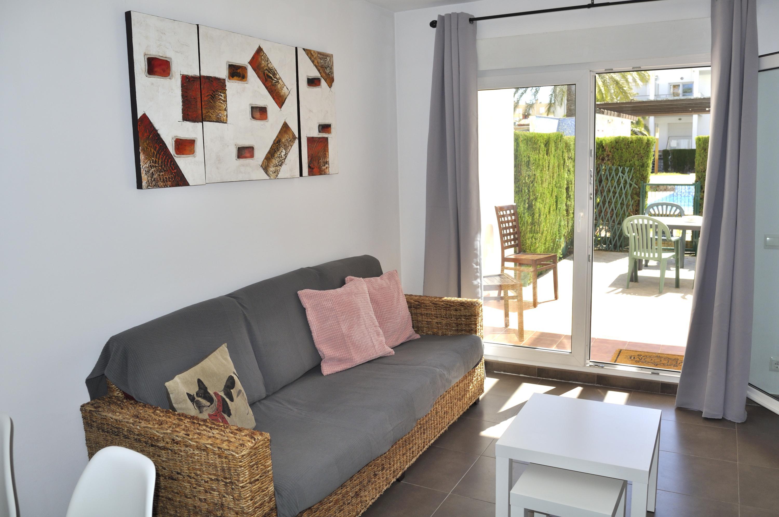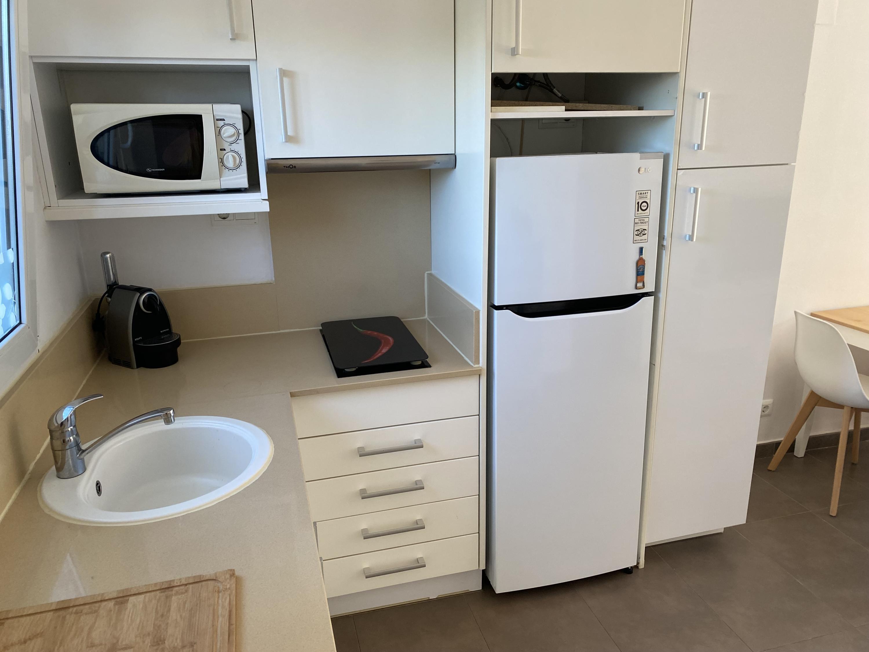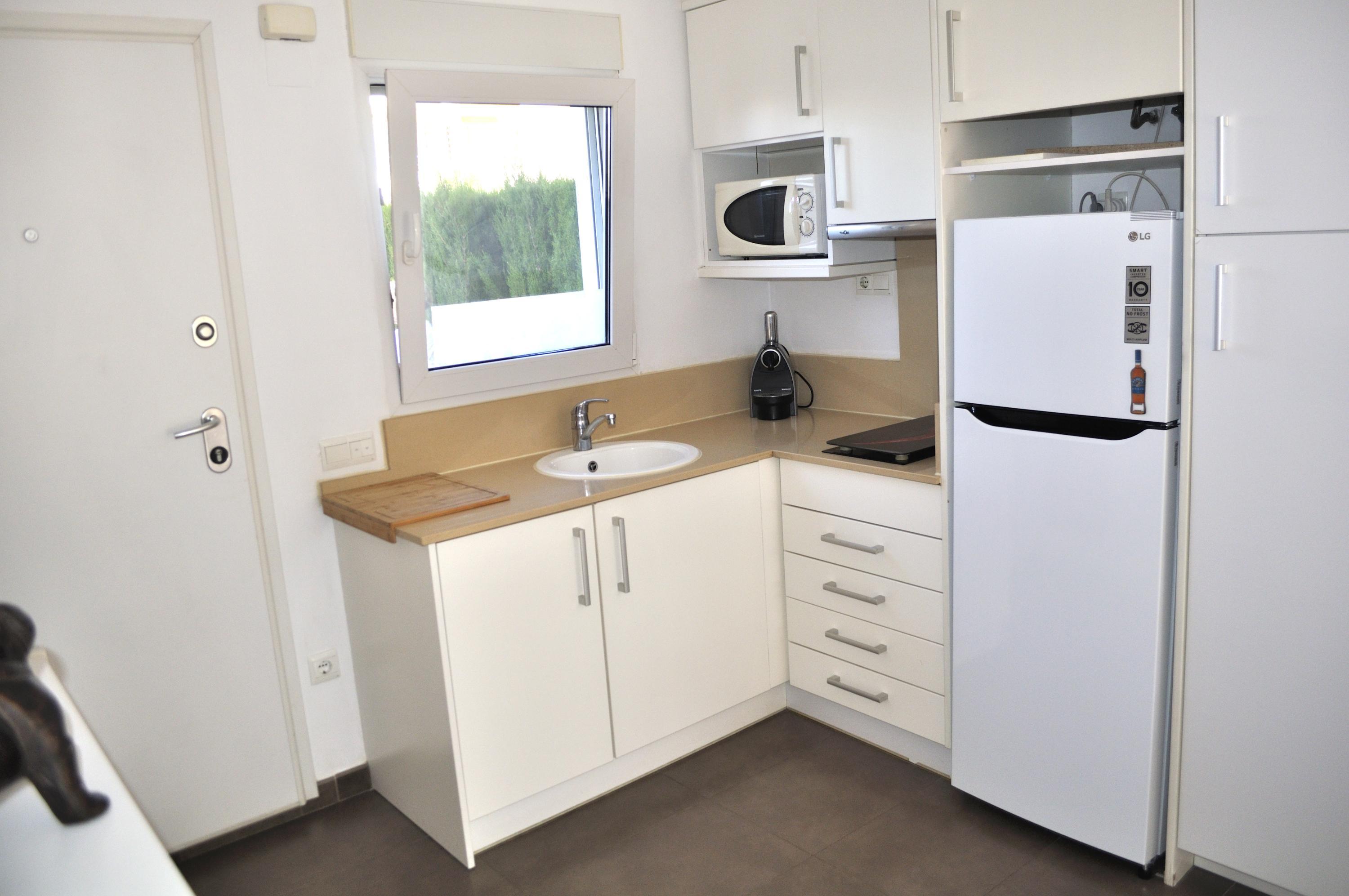 Sunny ground floor, with two bedrooms, one with double bed and the other with two single beds, bathroom with shower. Open fitted kitchen, washing machine. It has two terrace an exit from the sunny lounge in the mornings, and another rear terrraza with access from the kitchen, with sun in the afternoon. The apartment is in an urbanization, with communal pool, garden, and has a parking space sitting inside. 500 m from the beach and 1 km from the port of Denia