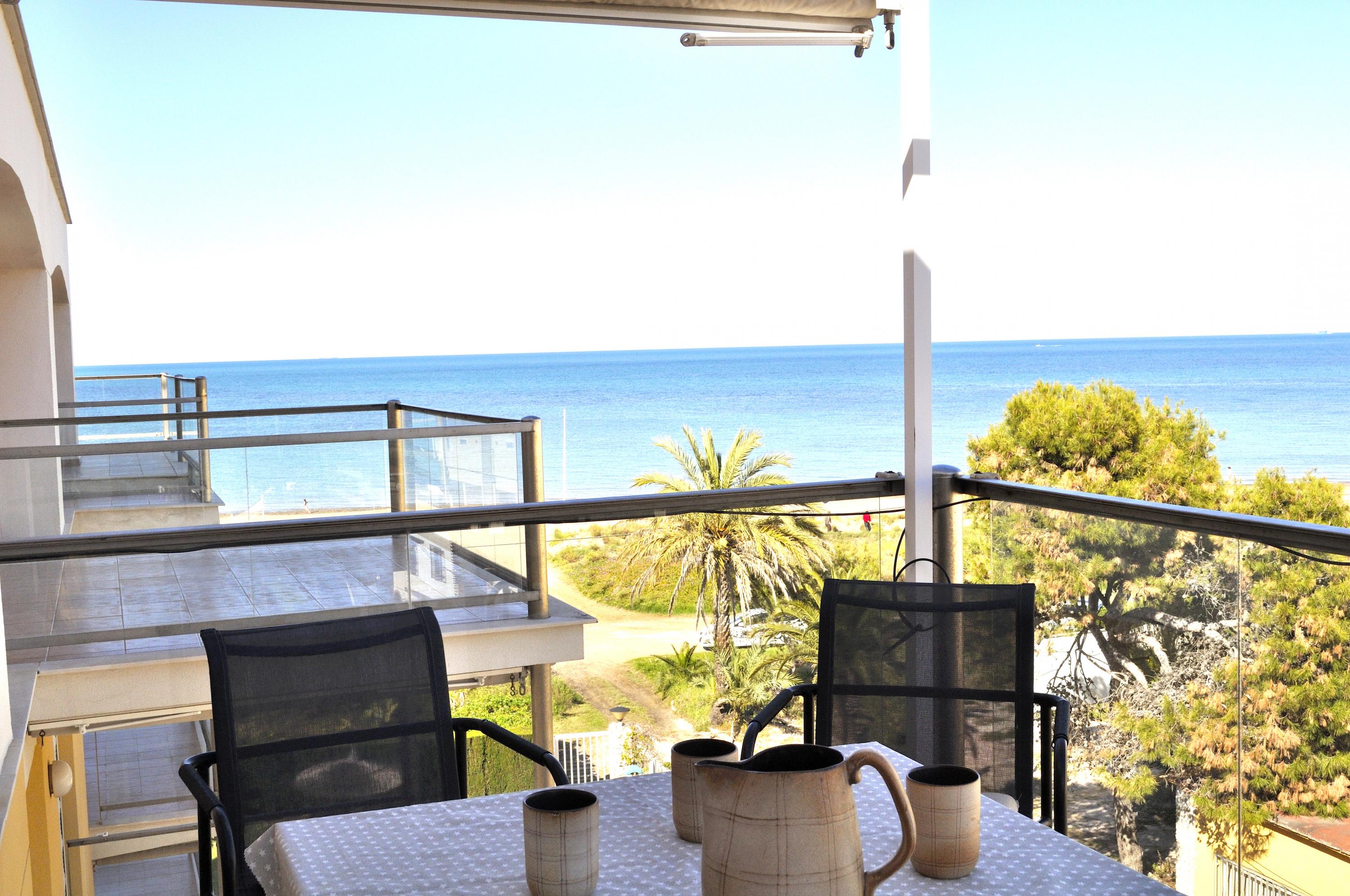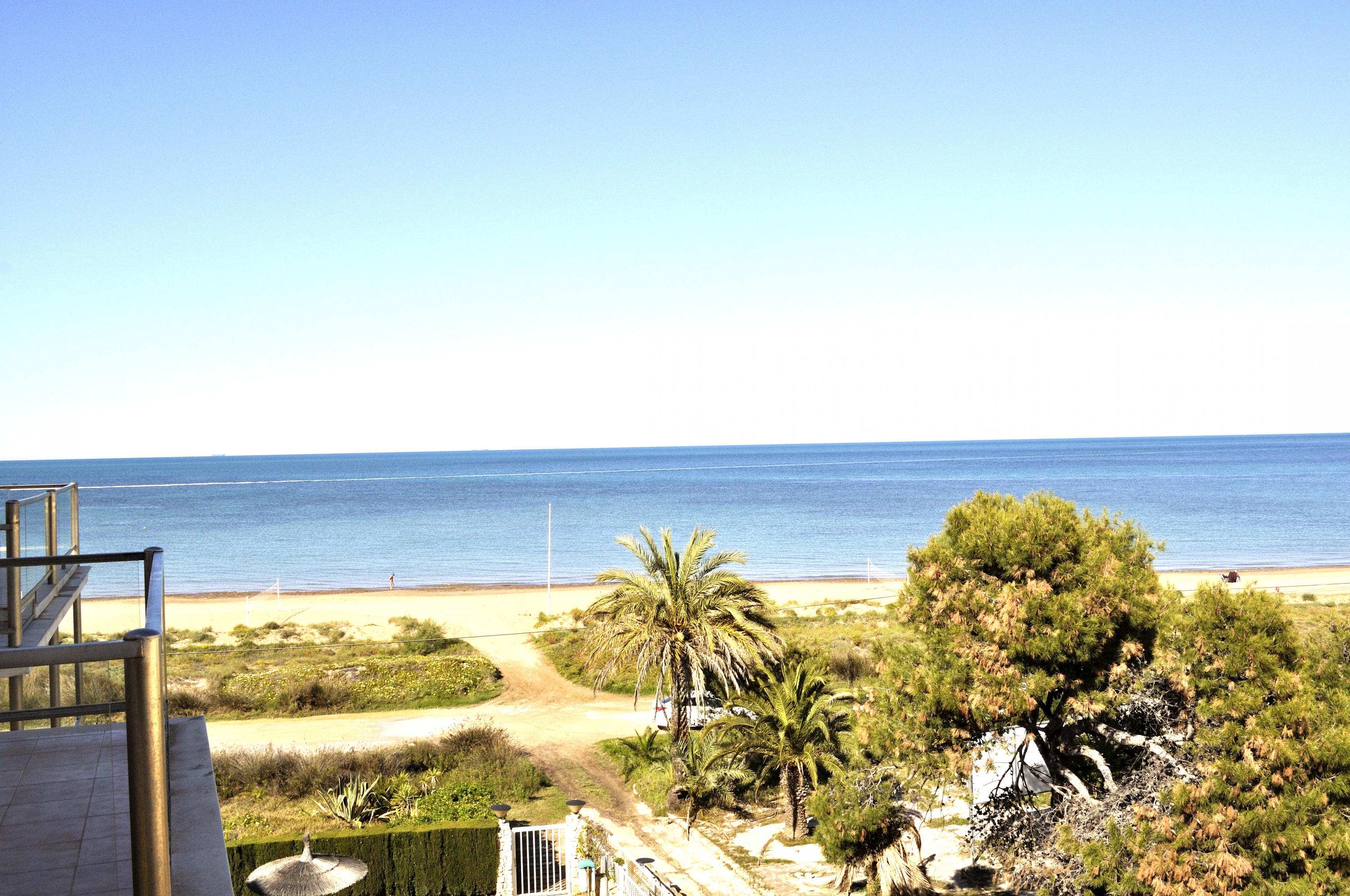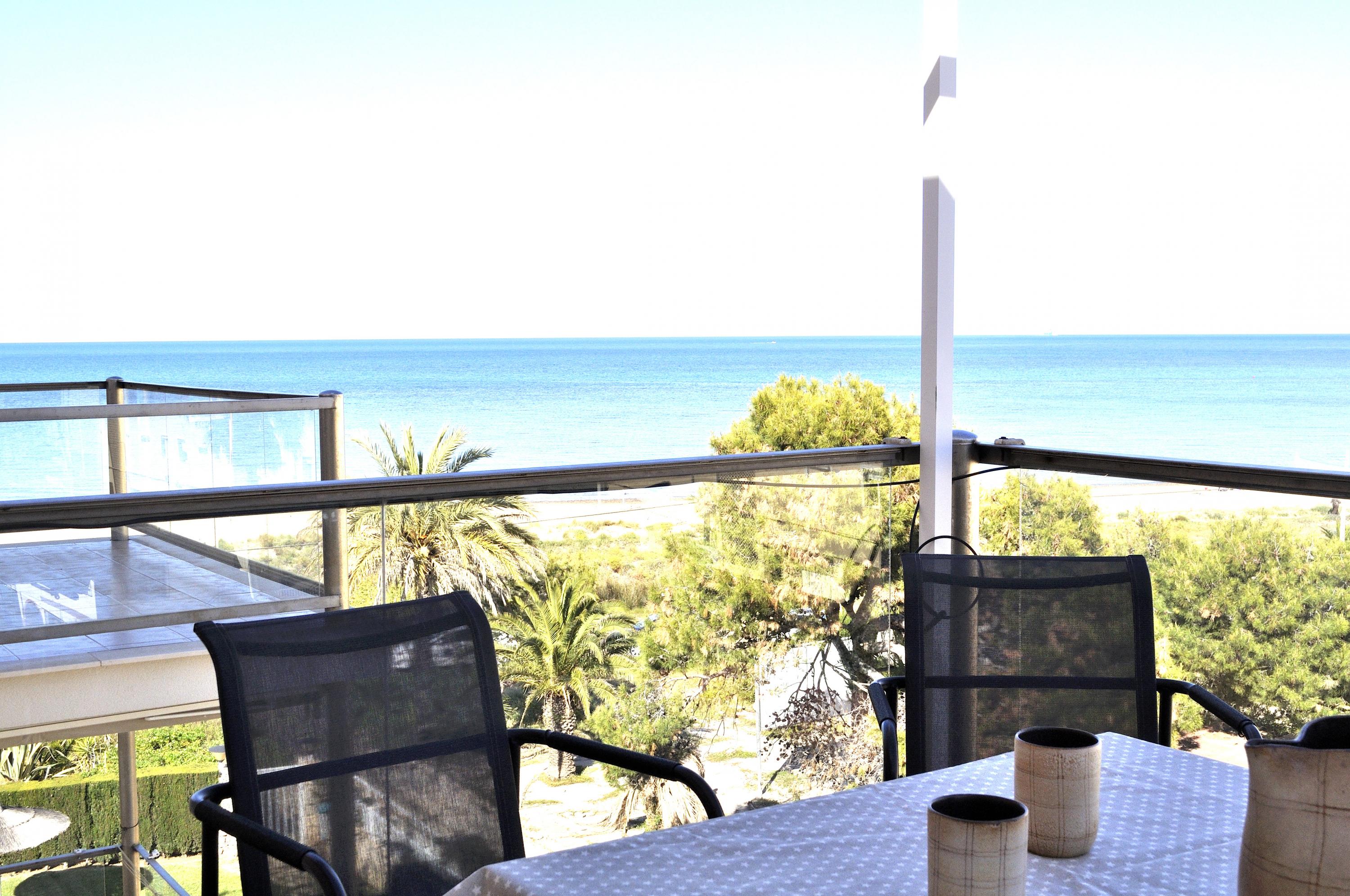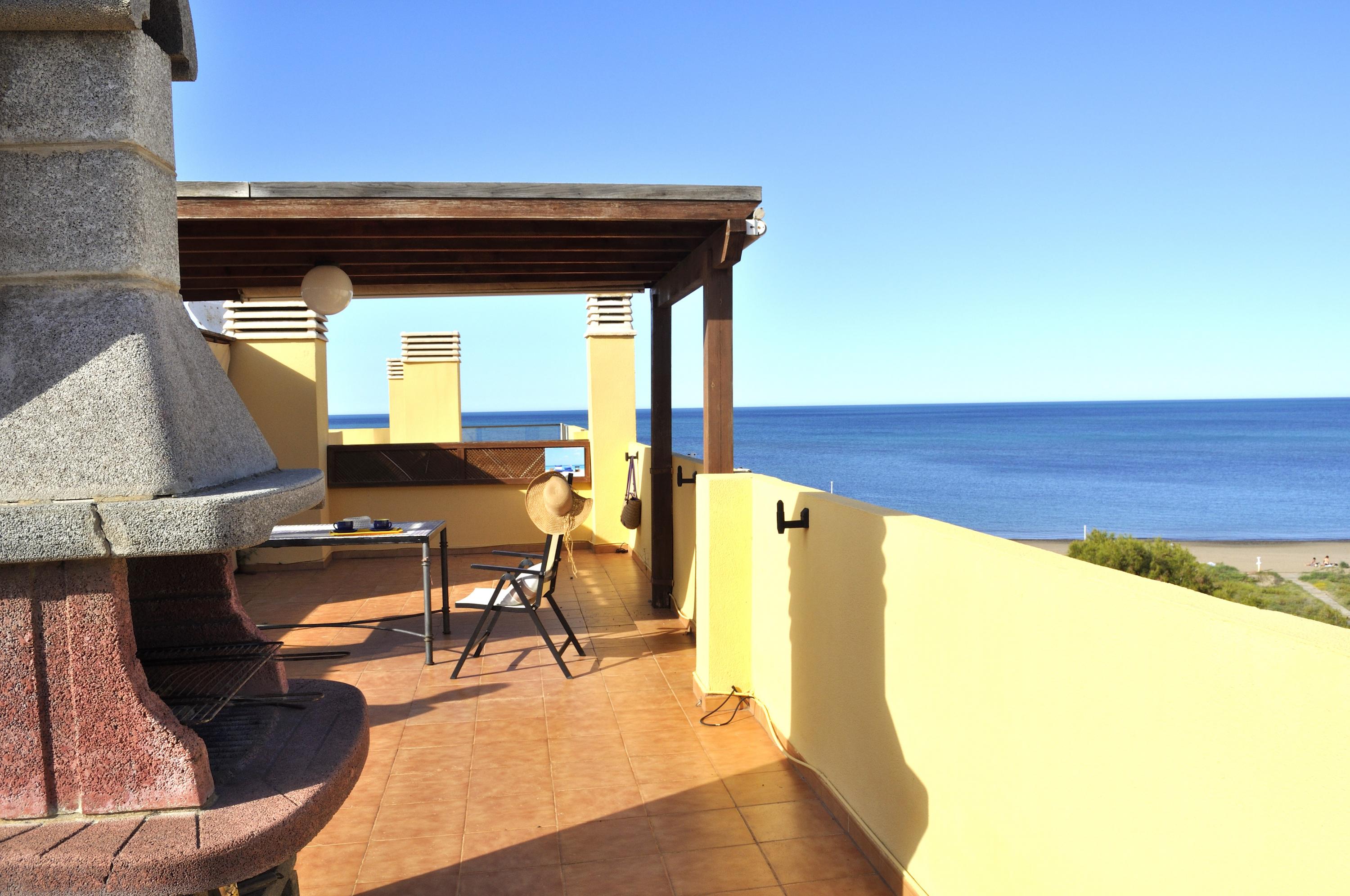 Sea front Apartment, several terraces overlooking the sea, ideal for summer vacancies without car the apartment en Catamaran Denia's urbanisation, 800m from the center the Urbanization has a communal swimming pool, garden with umbrellas, garage and direct exit to the Beach the Apartment has 2 double Bedrooms, principal Bedroom with double bed, ceiling fan, access to the terrace, full Bathroom with bathtub inside the bedroom An other Bedroom with two individuals beds Living&dining Room with access to the terrace with a nice view to the sea. fully closed kitchen with access to an other terrace ideal for having breakfast. Bathroom with shower. Interior Staircase with access to the Roof, impressive view of the sea, Pergola terrace furniture, Barbecue fixe.