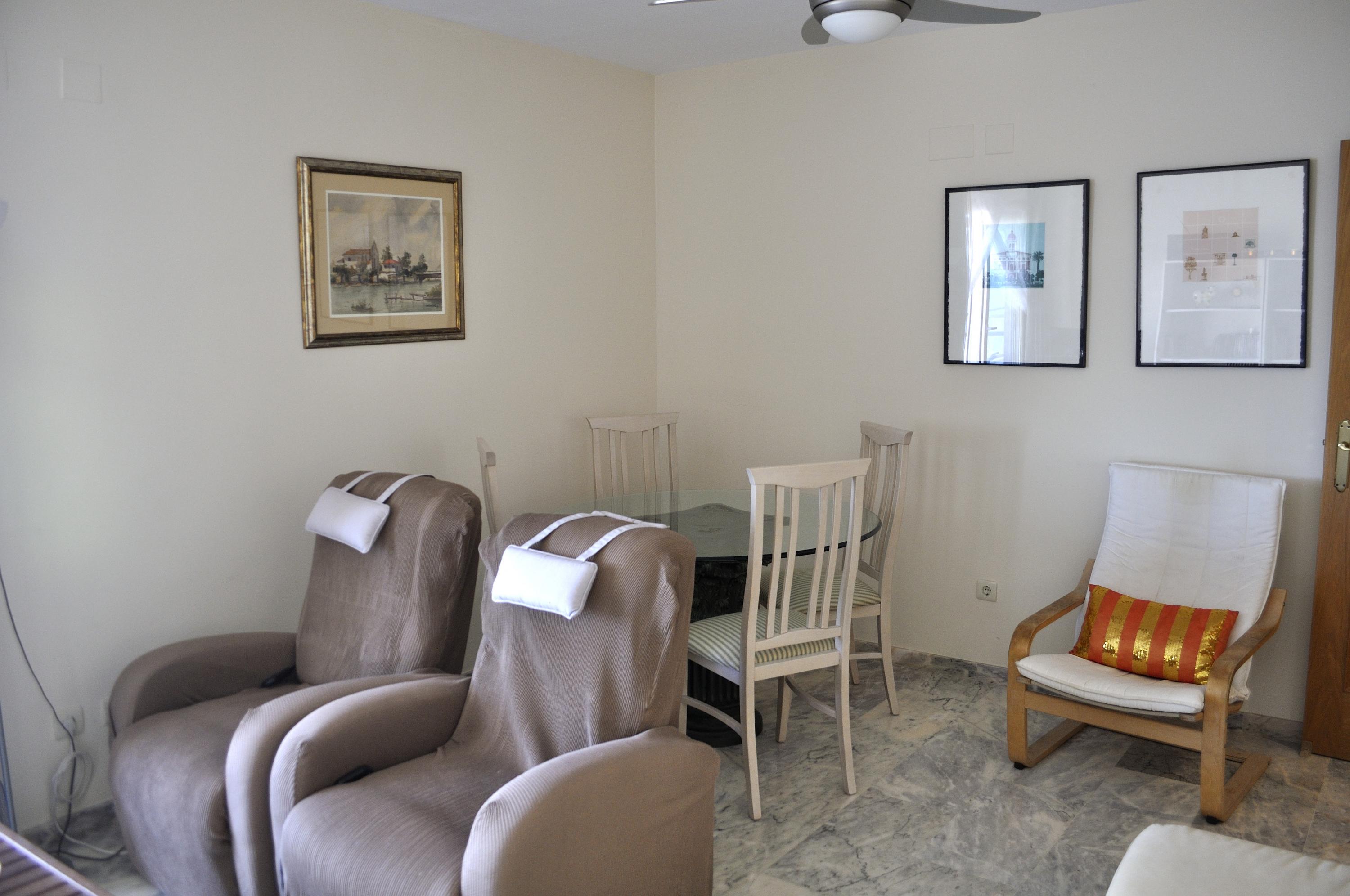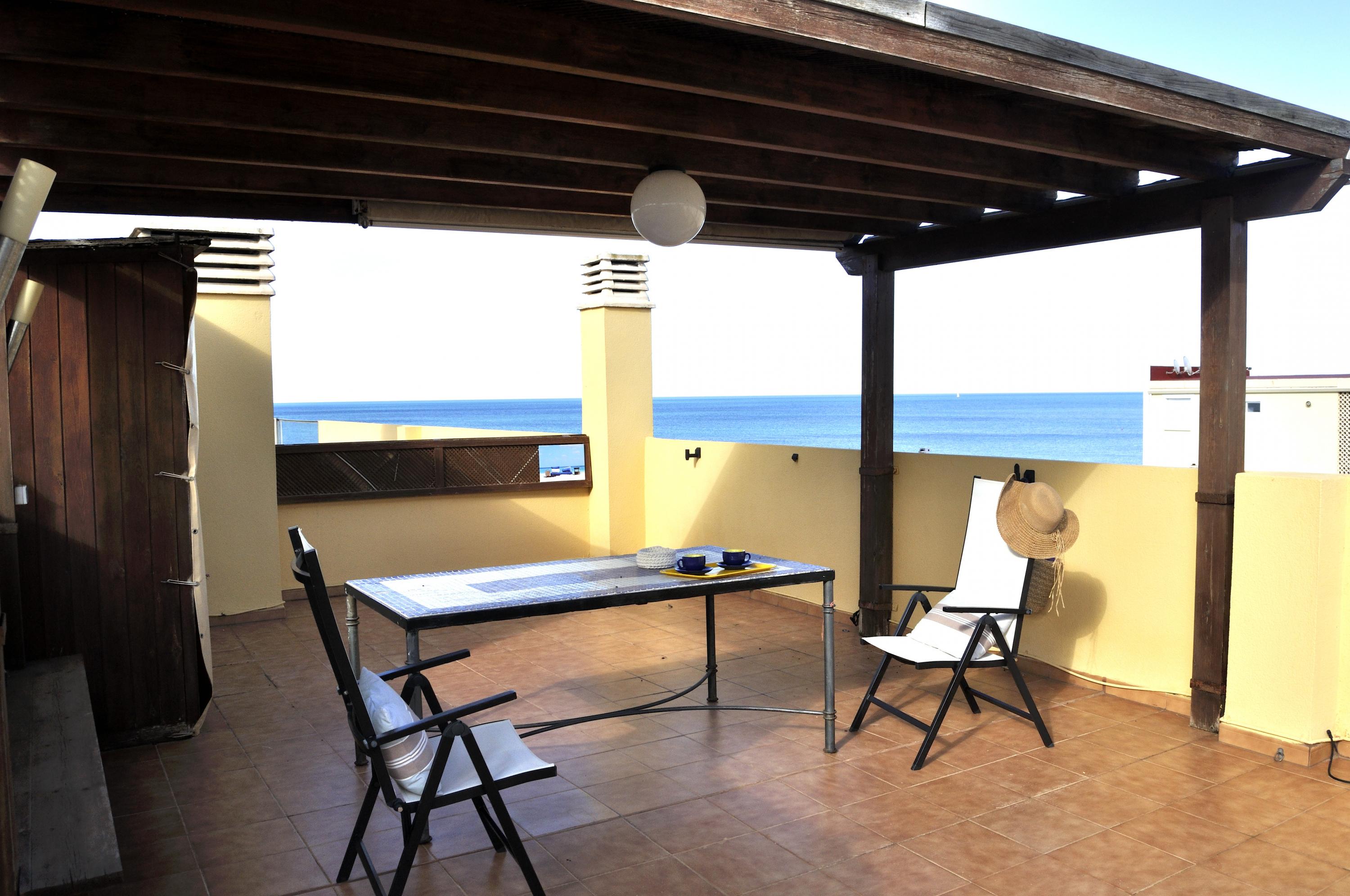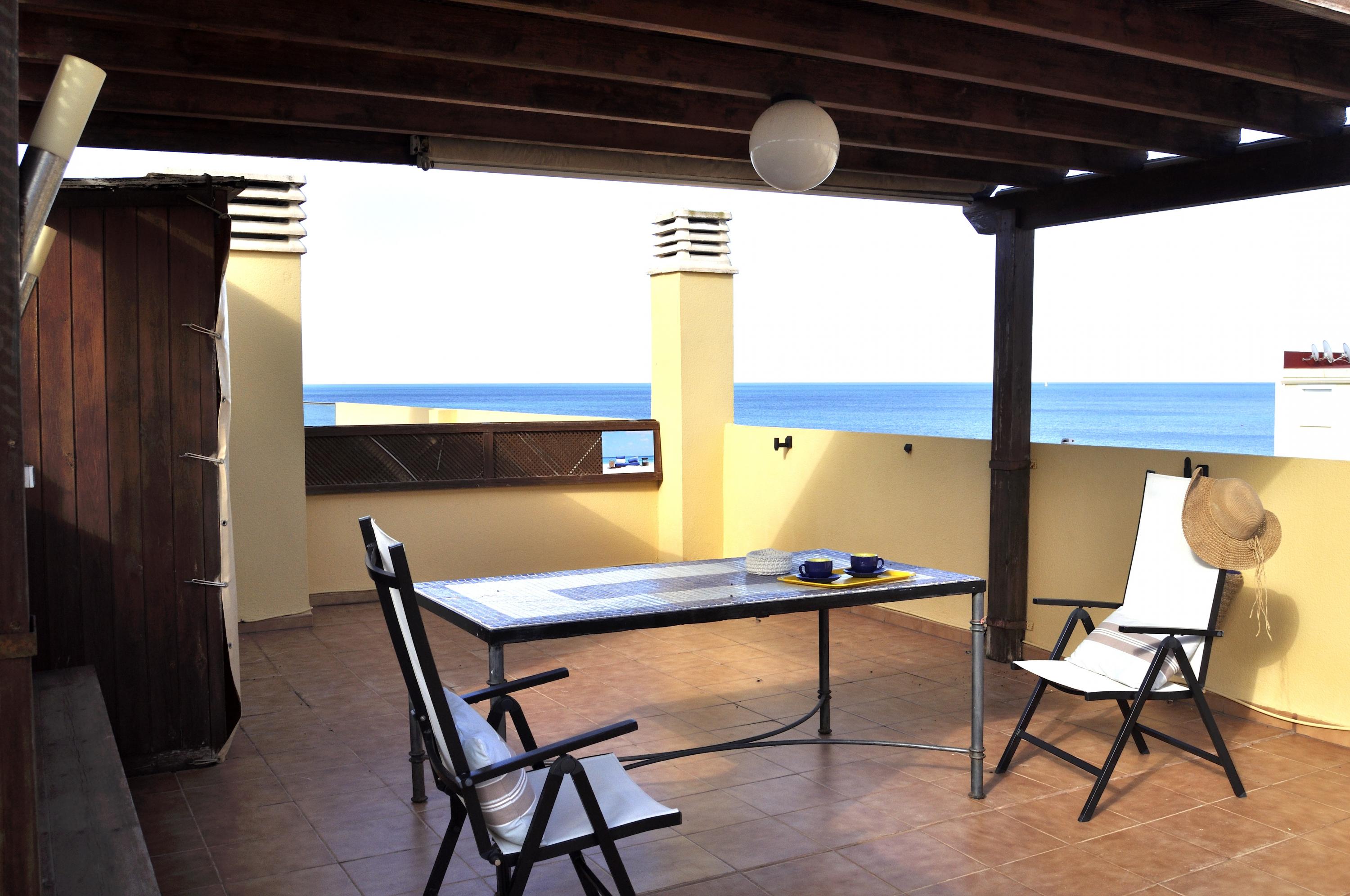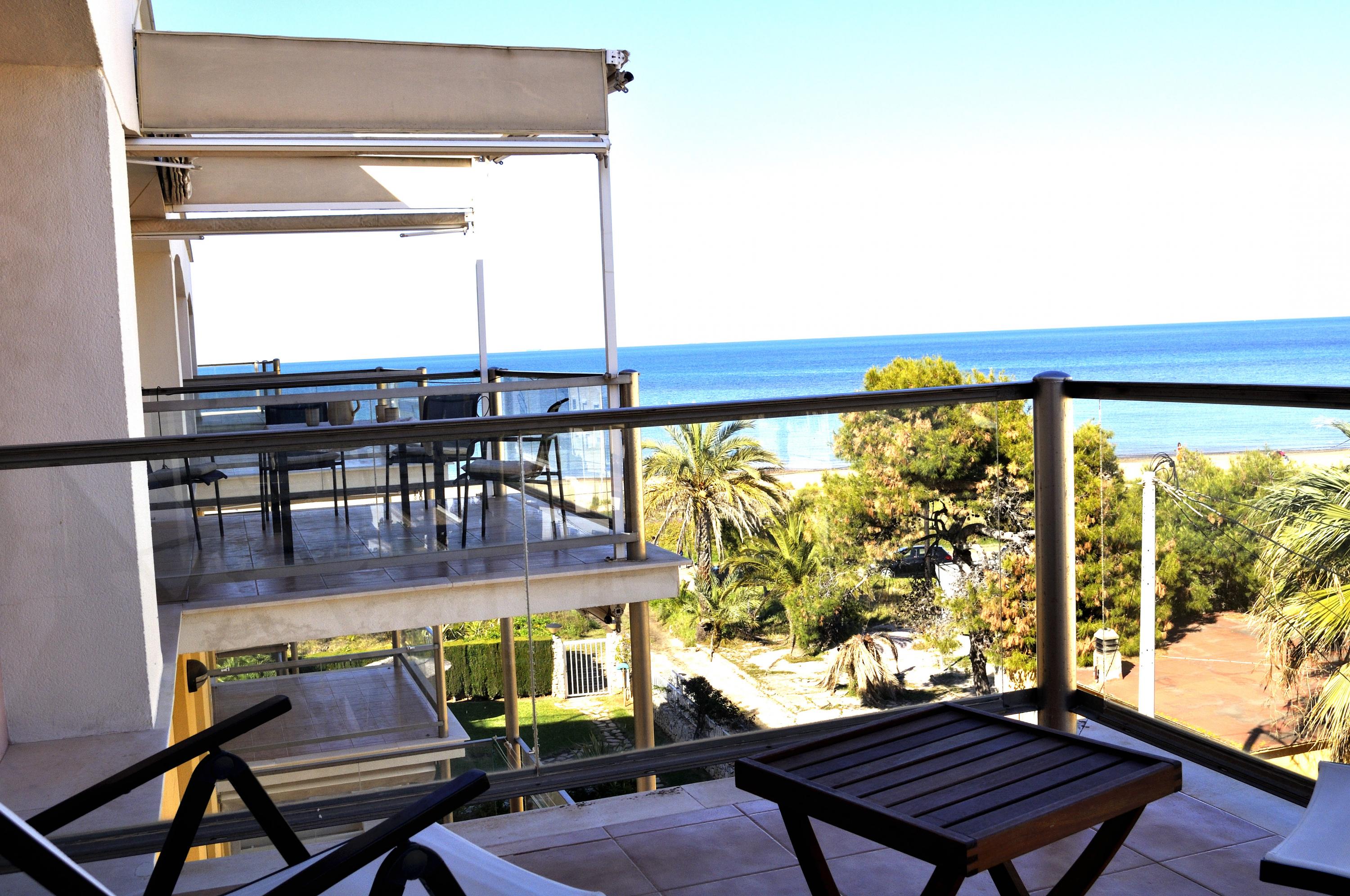 Sea front Apartment, several terraces overlooking the sea, ideal for summer vacancies without car the apartment en Catamaran Denia's urbanisation, 800m from the center the Urbanization has a communal swimming pool, garden with umbrellas, garage and direct exit to the Beach the Apartment has 2 double Bedrooms, principal Bedroom with double bed, ceiling fan, access to the terrace, full Bathroom with bathtub inside the bedroom An other Bedroom with two individuals beds Living&dining Room with access to the terrace with a nice view to the sea. fully closed kitchen with access to an other terrace ideal for having breakfast. Bathroom with shower. Interior Staircase with access to the Roof, impressive view of the sea, Pergola terrace furniture, Barbecue fixe.