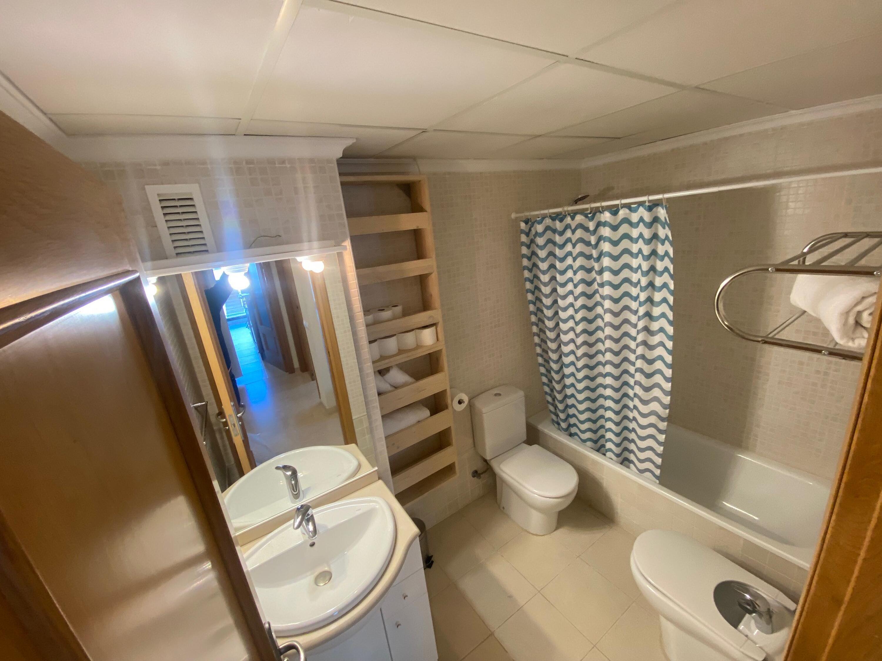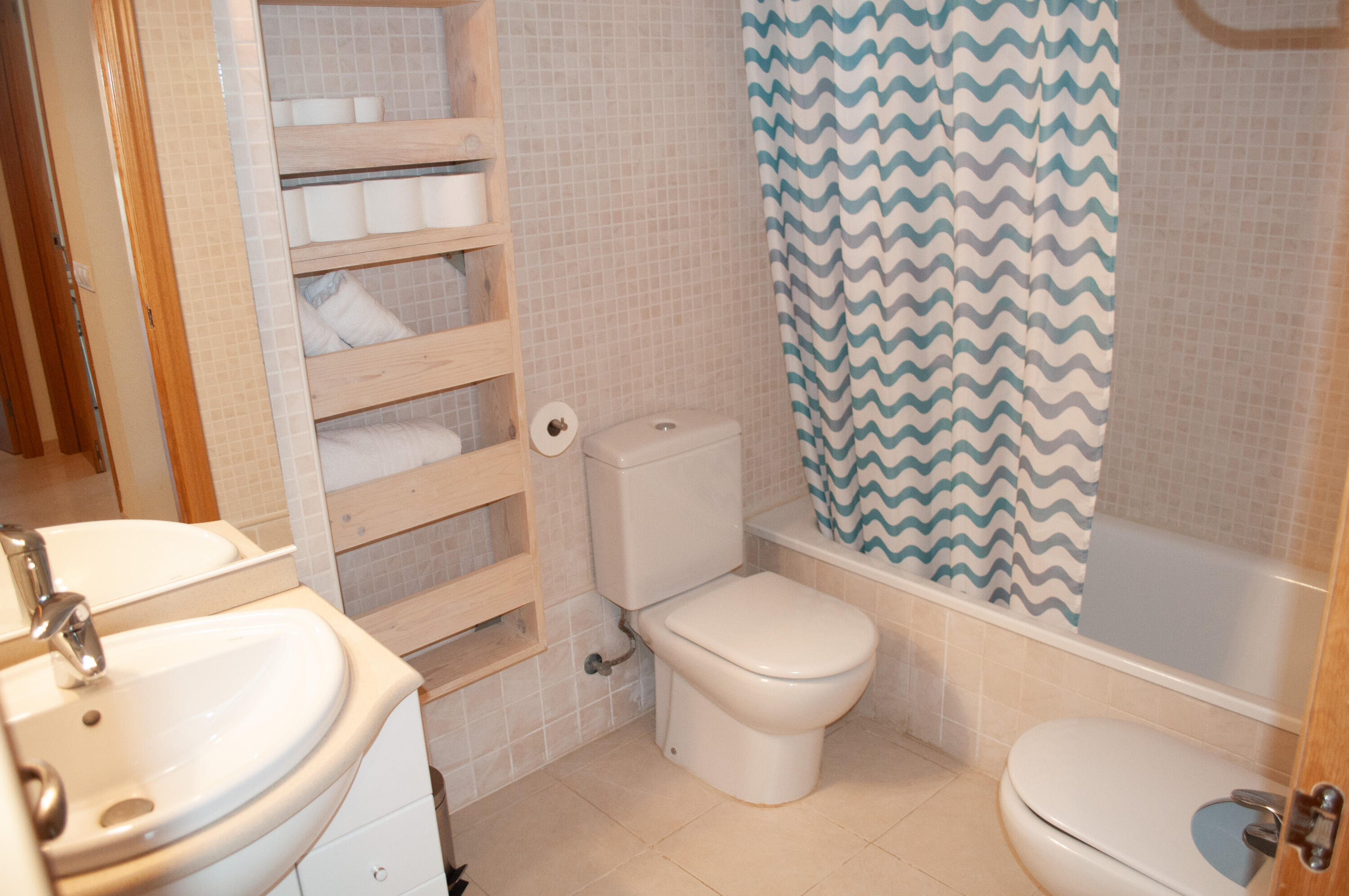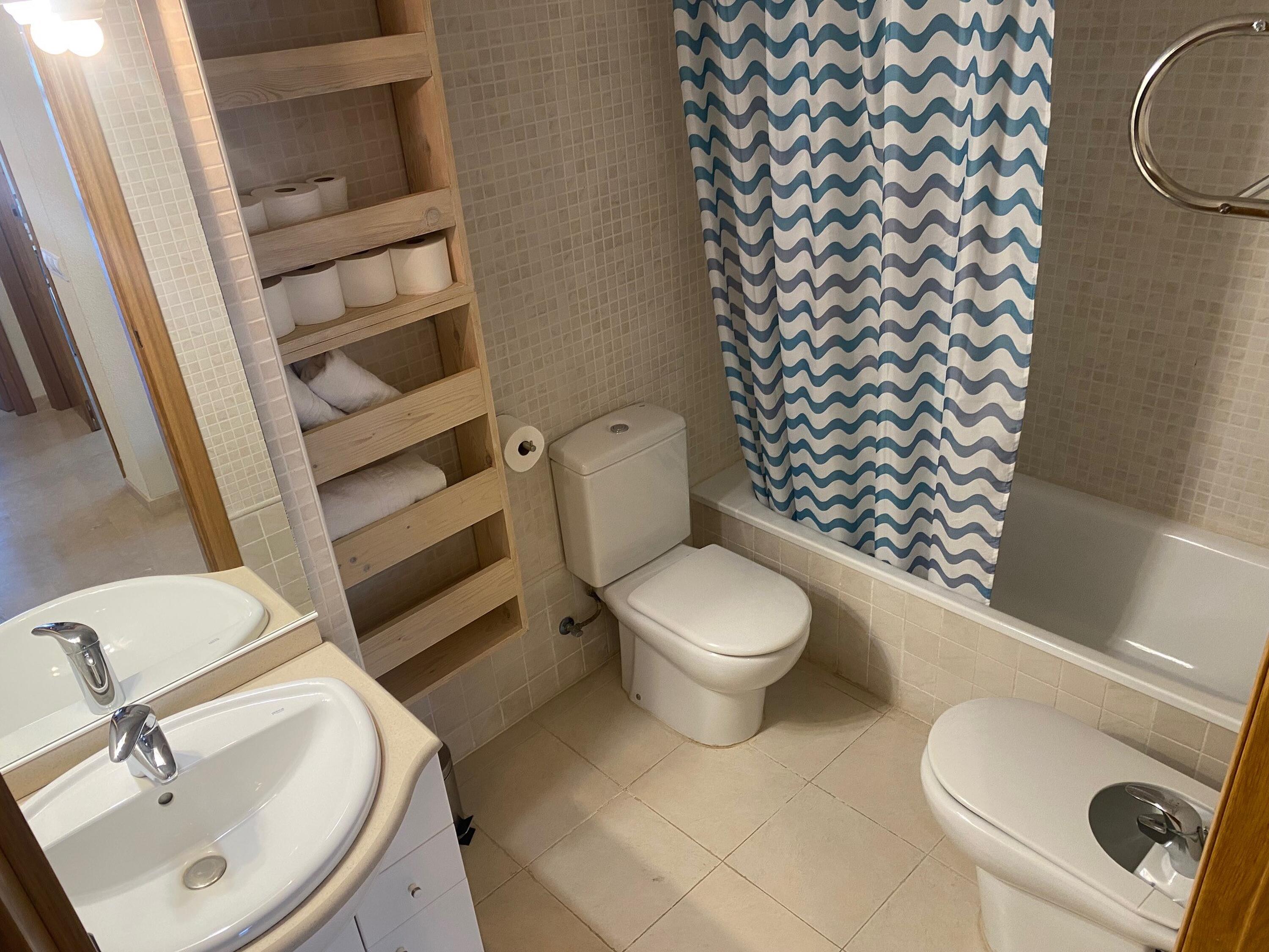The apartment features 3 bedrooms: one with a double bed, one with two single beds, and a third with a single bed. All rooms are tastefully decorated in a fresh and functional Mediterranean style to ensure a relaxing stay. There are two full bathrooms: one with a modern shower and the other with a bathtub, offering flexibility and comfort.