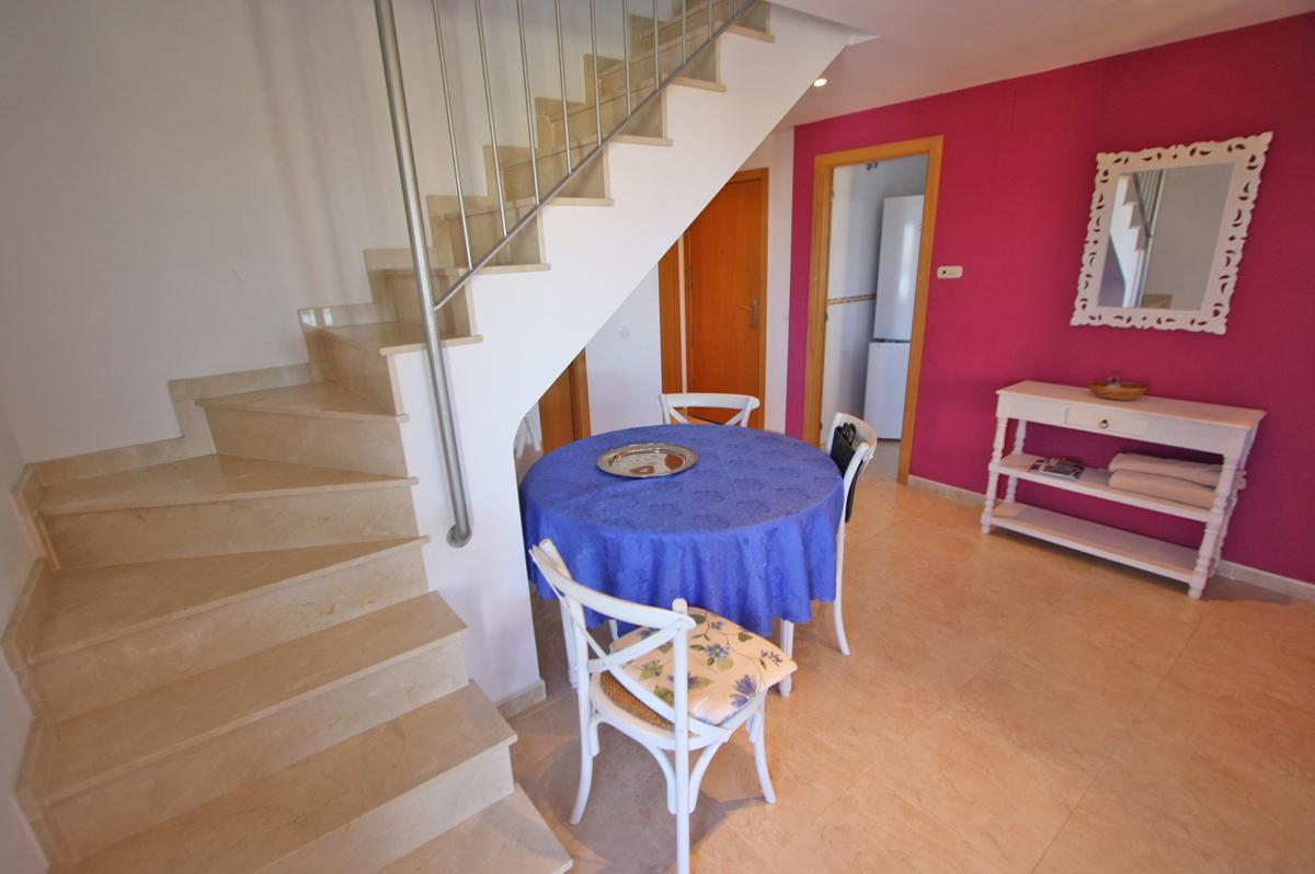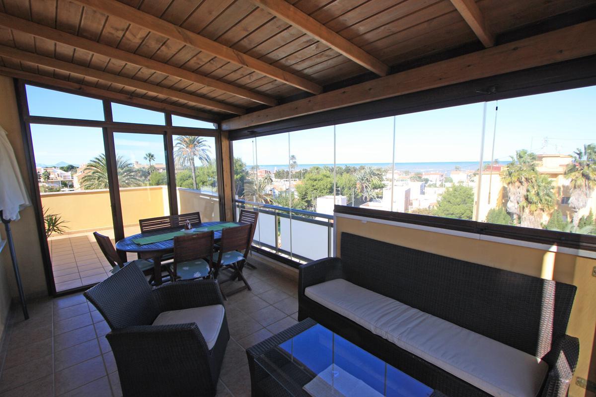Charming duplex penthouse with sea views, with an unbeatable location, just 200 m from the sandy beach, and 1.50km from Dénia port. Very close to restaurants and supermarkets. On the first floor there is a room with double bed and bathroom with bathtub and another room with a trundle bed, which can be opened, if necessary, a bathroom with shower, separate kitchen, and living room. In addition to a large terrace with magnificent views of the sea and the Montgo, a part of the terrace is glazed, creating a magnificent living room. On the second floor, it has a bedroom with double bed, a bathroom with shower and another terrace. Kitchen is fully equipped, dishwasher, oven, washing machine etc. The apartment has satellite TV, Wifi, central air conditioning hot/cold . Community pool garden area, small playground and covered parking within the urbanization.