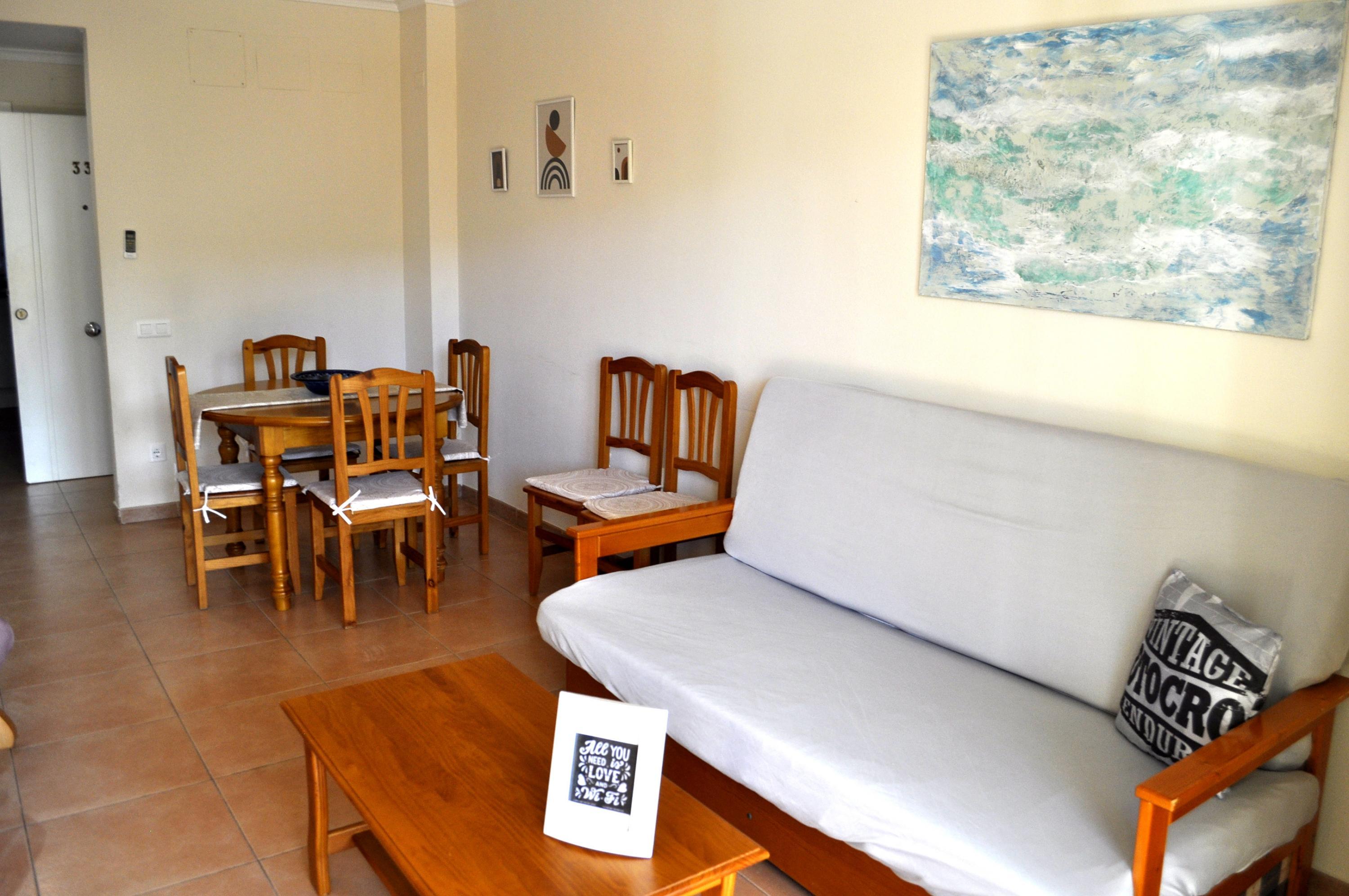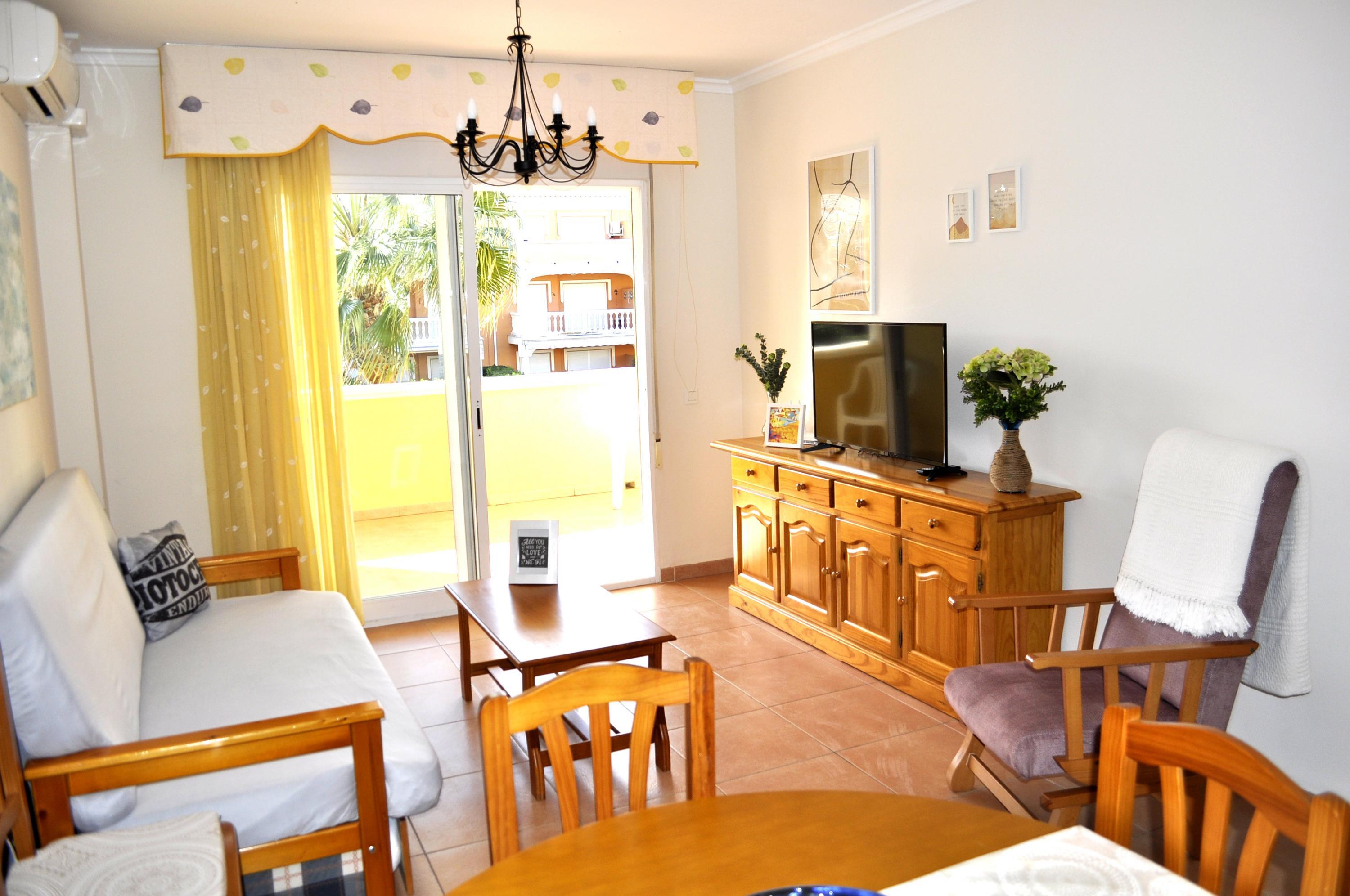 Apartment for 5 People. The apartment has 2 bedrooms: one with double bed (150 cms mattress), access to the terrace and the other bedroom with 2 individuals beds. Siting room with sofa bed, exit to the terrace with view to the communal swimming pool. Full bathroom with bathtub. Fully kitchen separated, gallery with washing machine. Covered parking place inside of the urbanization. The Urbanization has communal swimming pool, big garden and paddle tennis. The situation of Estrella Blanca's urbanization es unbeatable, only 1.5 km from Denia, 200 meters from the beach, in its surroundings it has supermarkets, restaurants, leisure, ideal for spending the summer without a car.