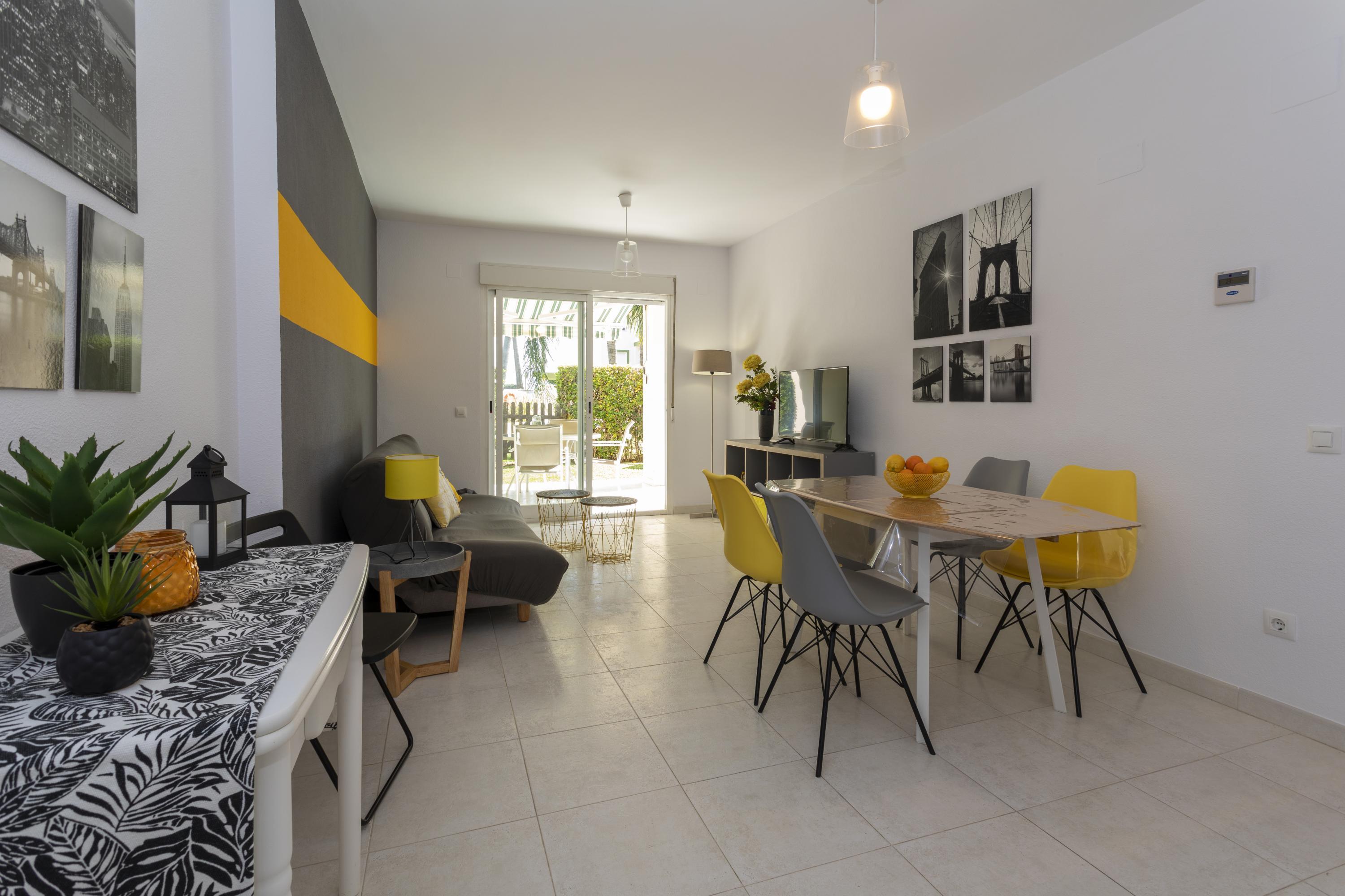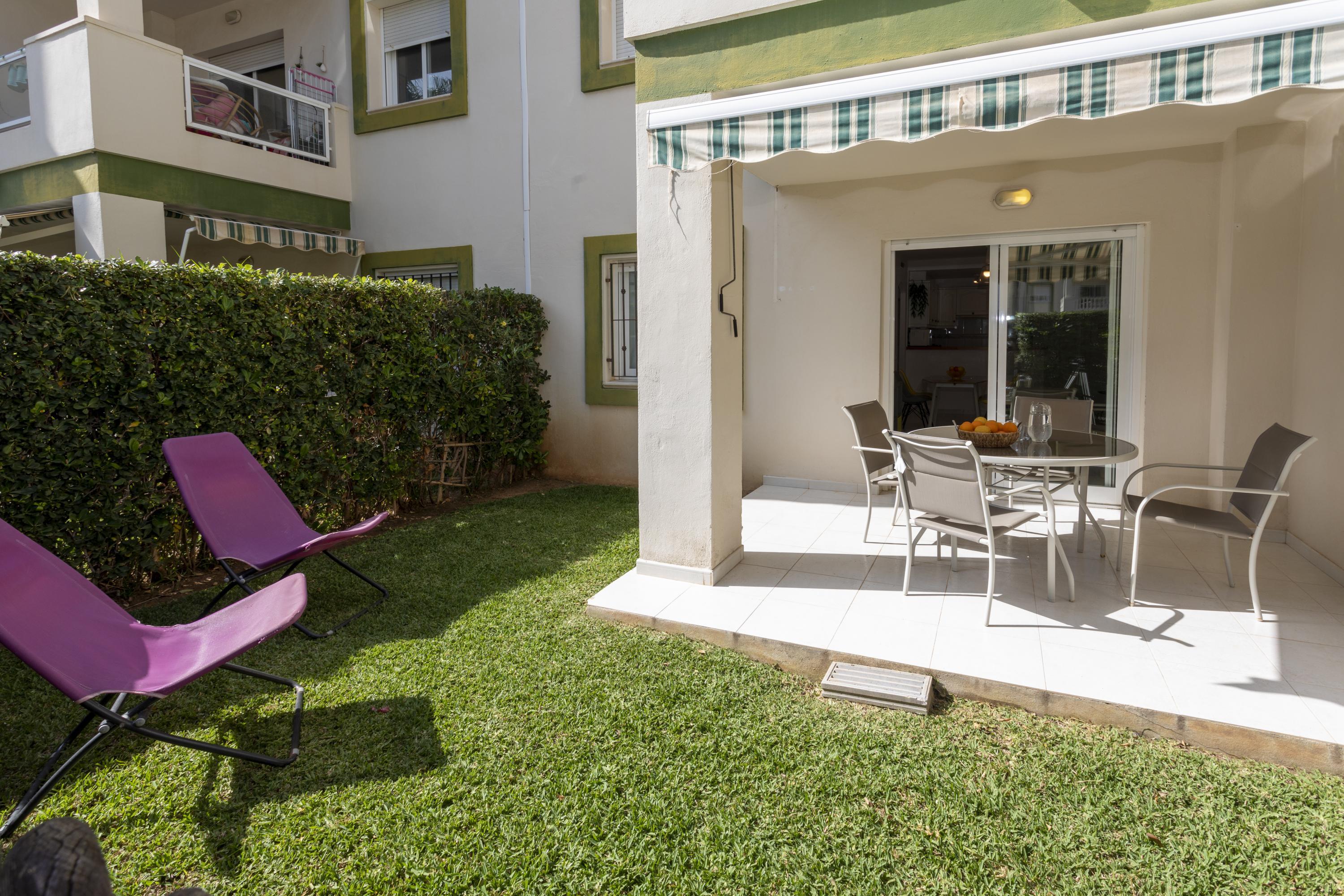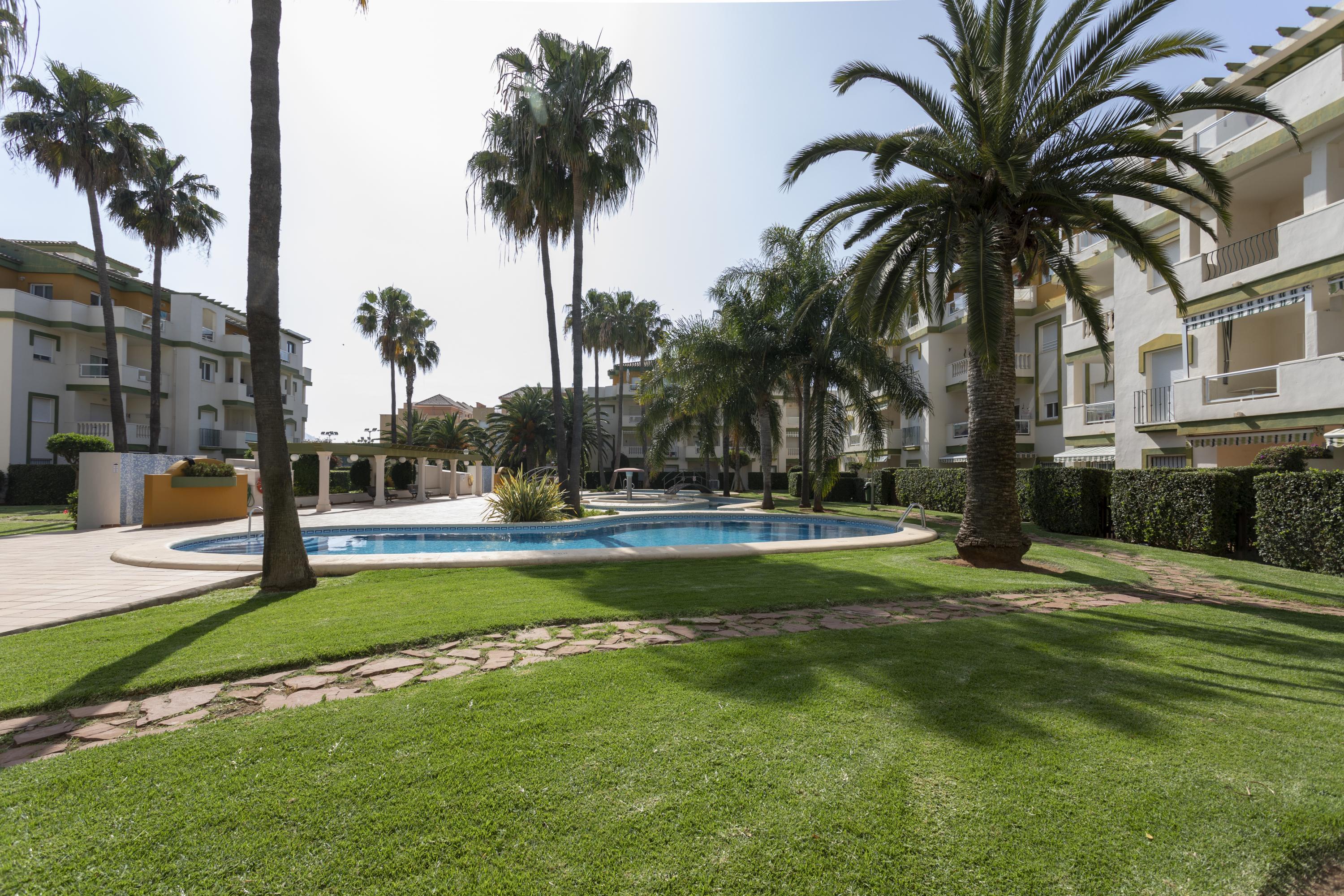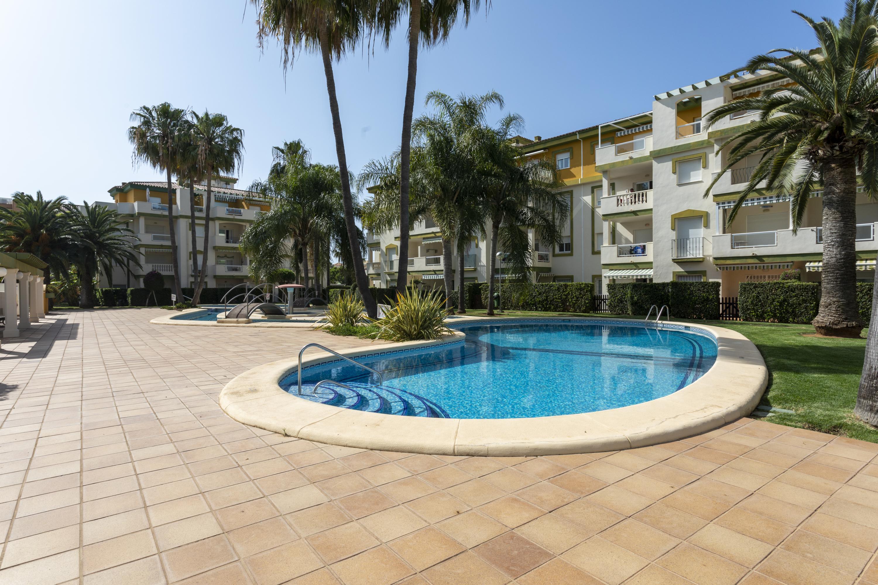 Cozy ground floor apartment with two bedrooms, terrace overlooking the communal pool. It consists of 2 double bedrooms, one with a double bed and the other with two single beds, a full kitchen with a breakfast bar, a living-dining room, Spanish TV and SAT, a full bathroom with a bathtub and a shower room. Central air conditioning. Parking space within the urbanization. The location of the apartment is perfect for a relaxing beach holiday, just 250 meters from Els Molins Dénia beach, in its surroundings there is a supermarket and several restaurants.