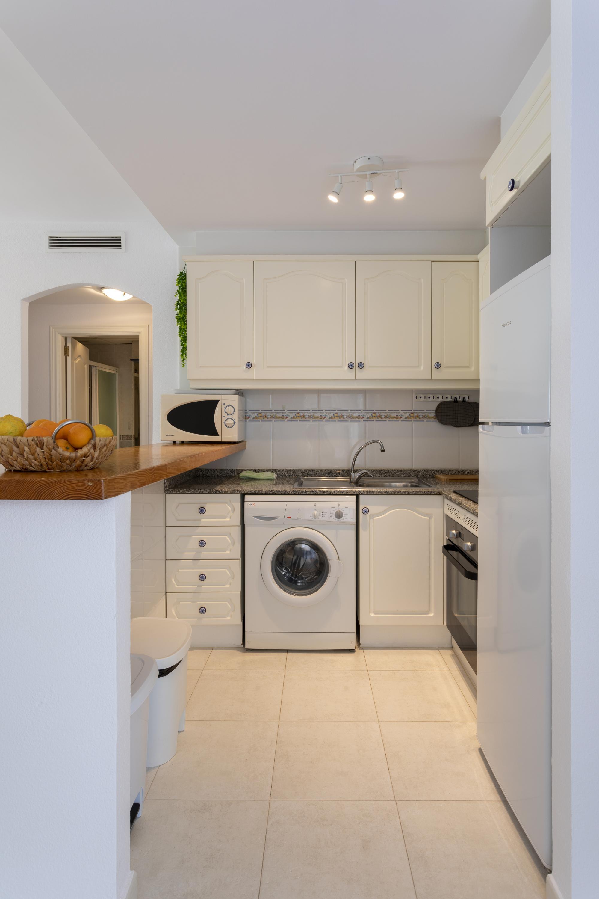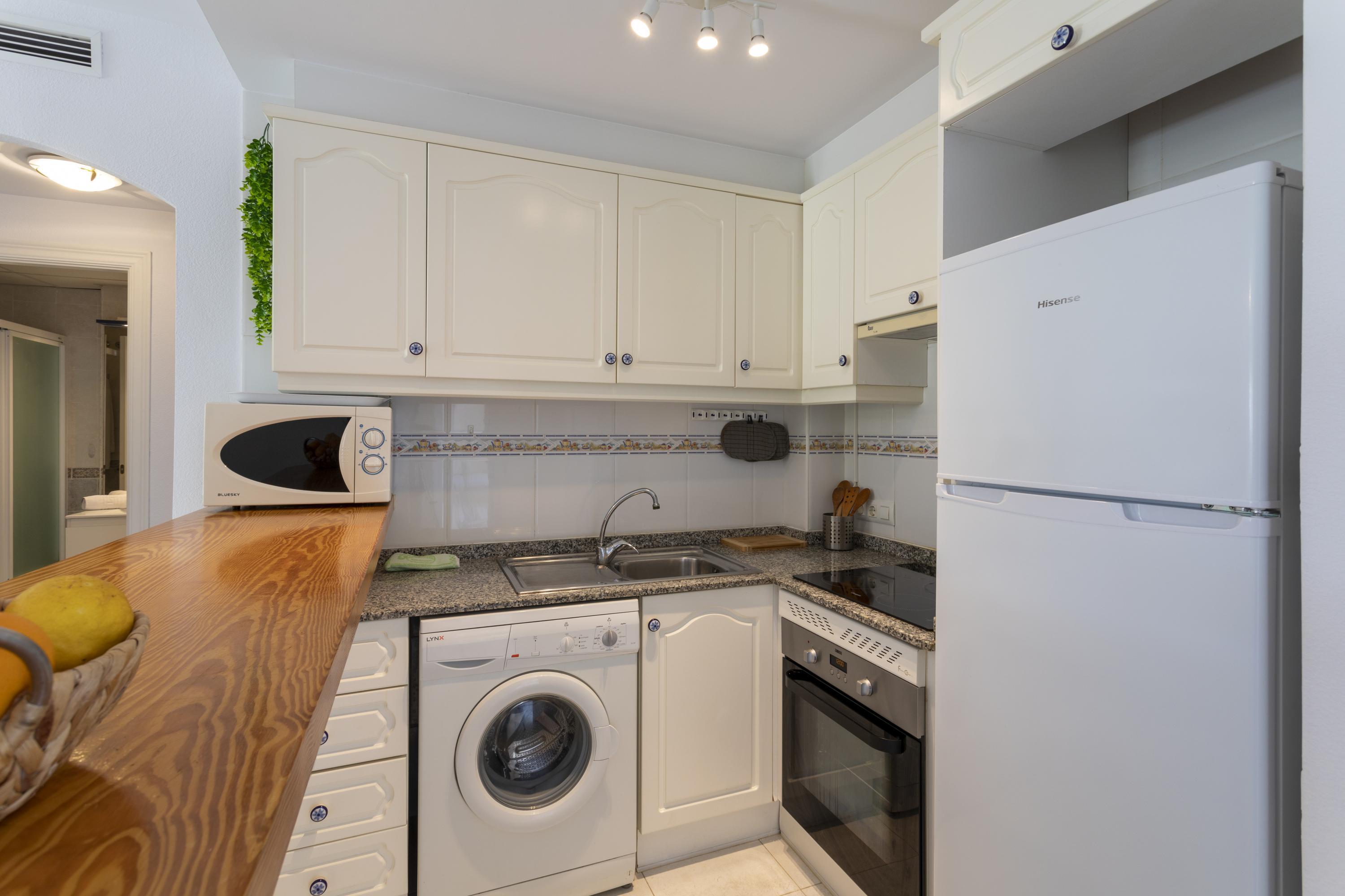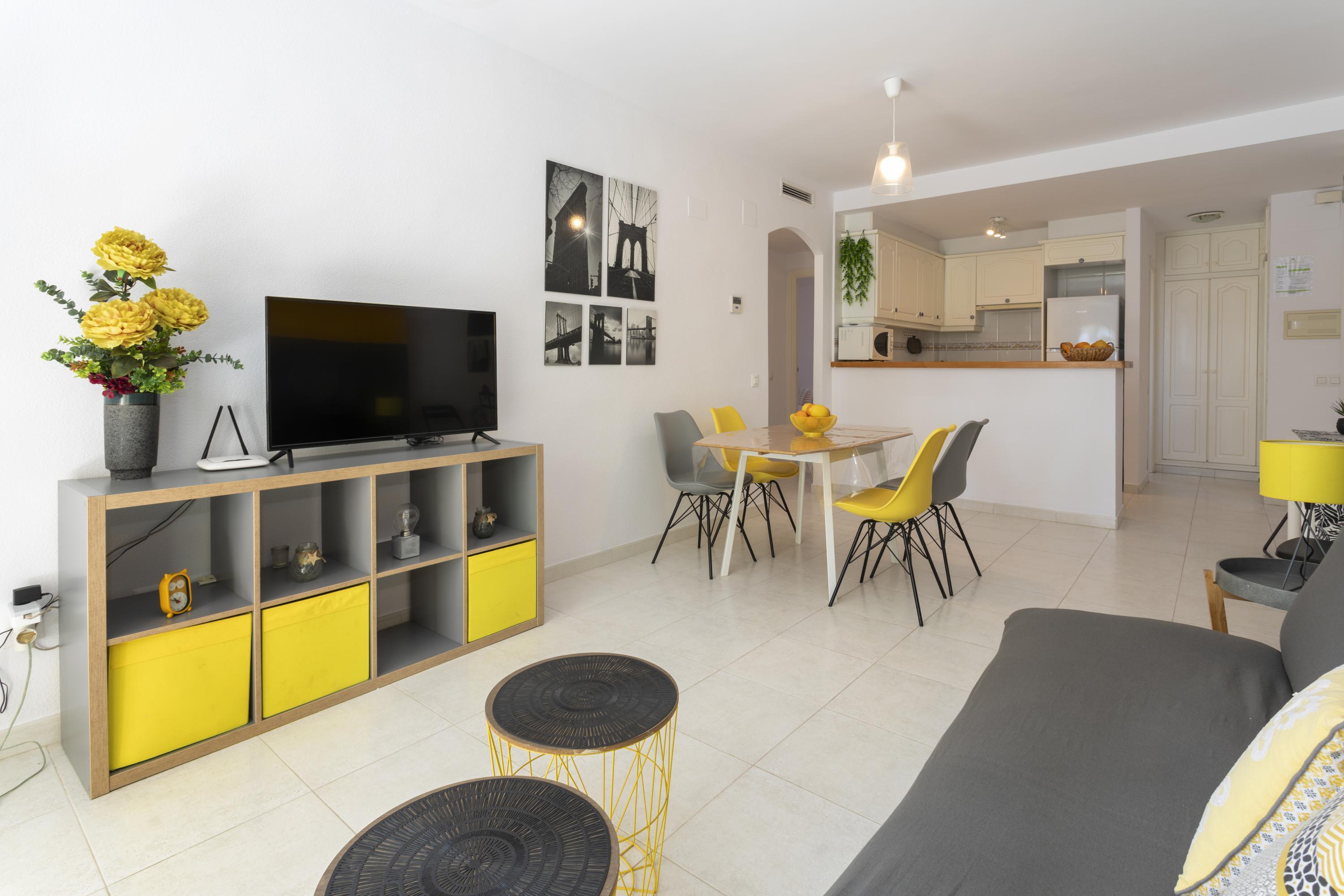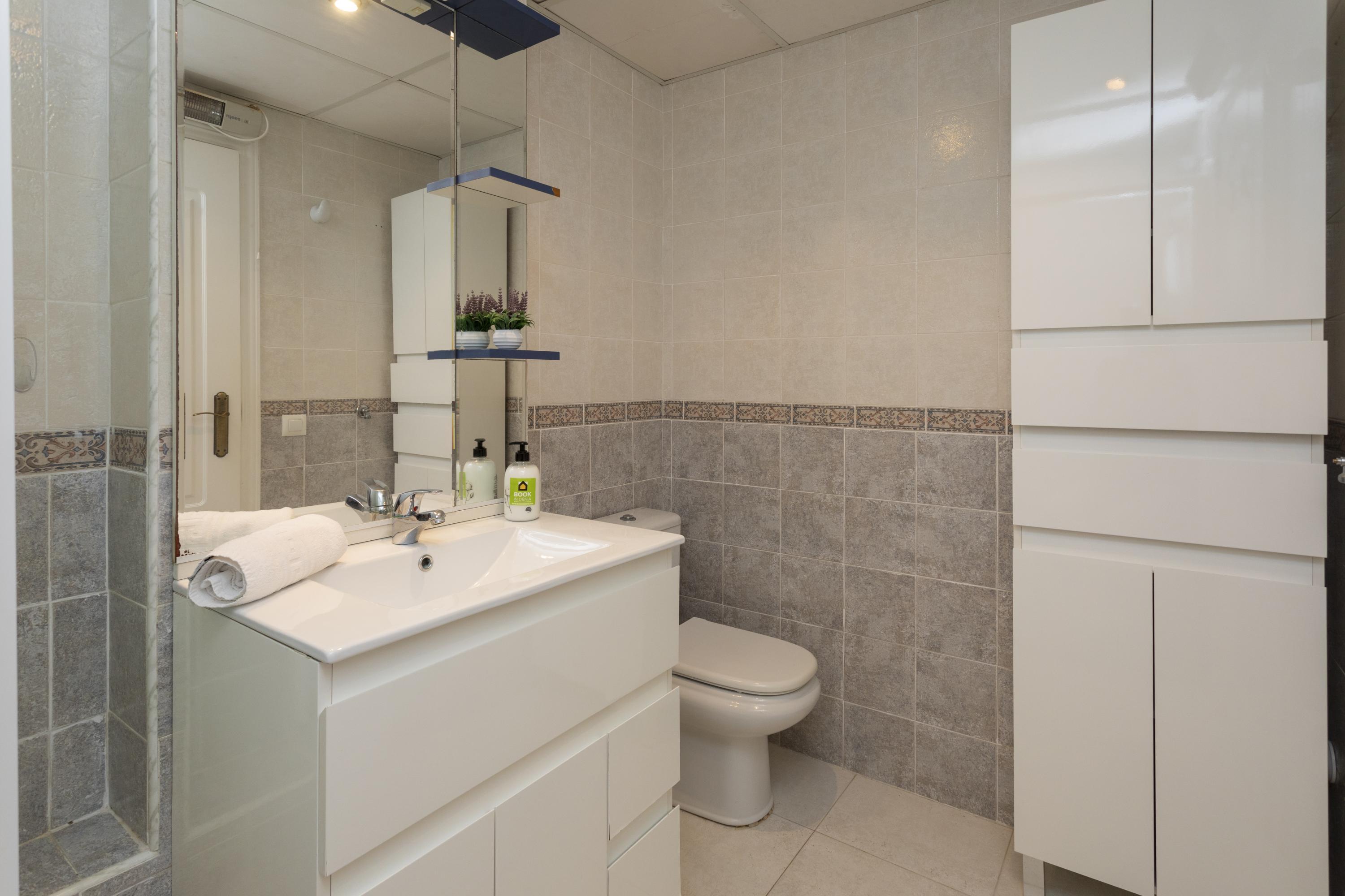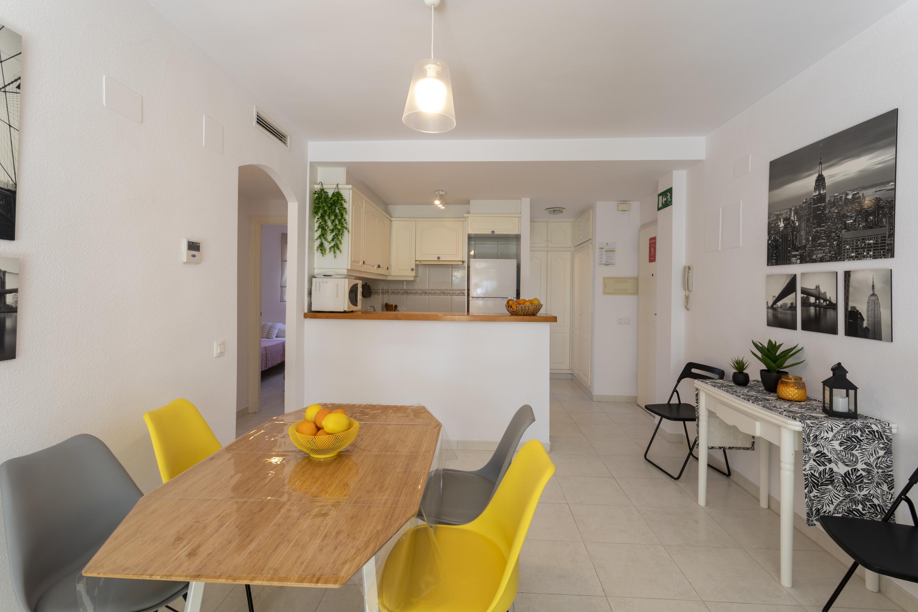 Cozy ground floor apartment with two bedrooms, terrace overlooking the communal pool. It consists of 2 double bedrooms, one with a double bed and the other with two single beds, a full kitchen with a breakfast bar, a living-dining room, Spanish TV and SAT, a full bathroom with a bathtub and a shower room. Central air conditioning. Parking space within the urbanization. The location of the apartment is perfect for a relaxing beach holiday, just 250 meters from Els Molins Dénia beach, in its surroundings there is a supermarket and several restaurants.