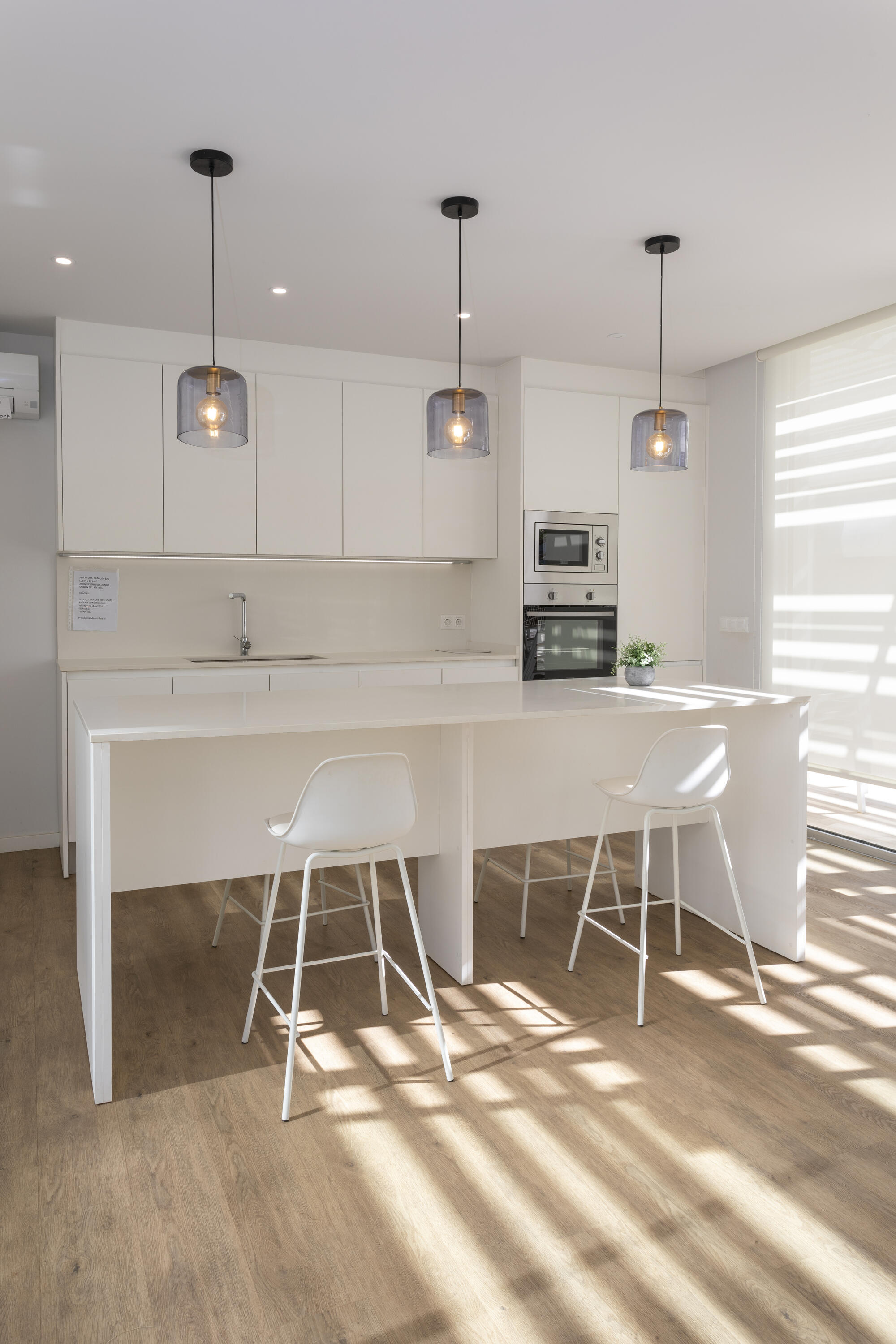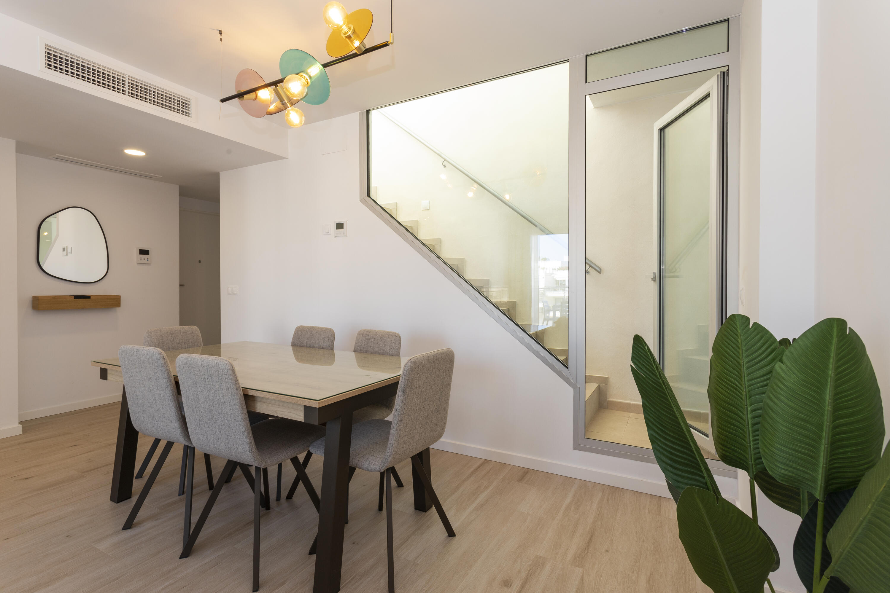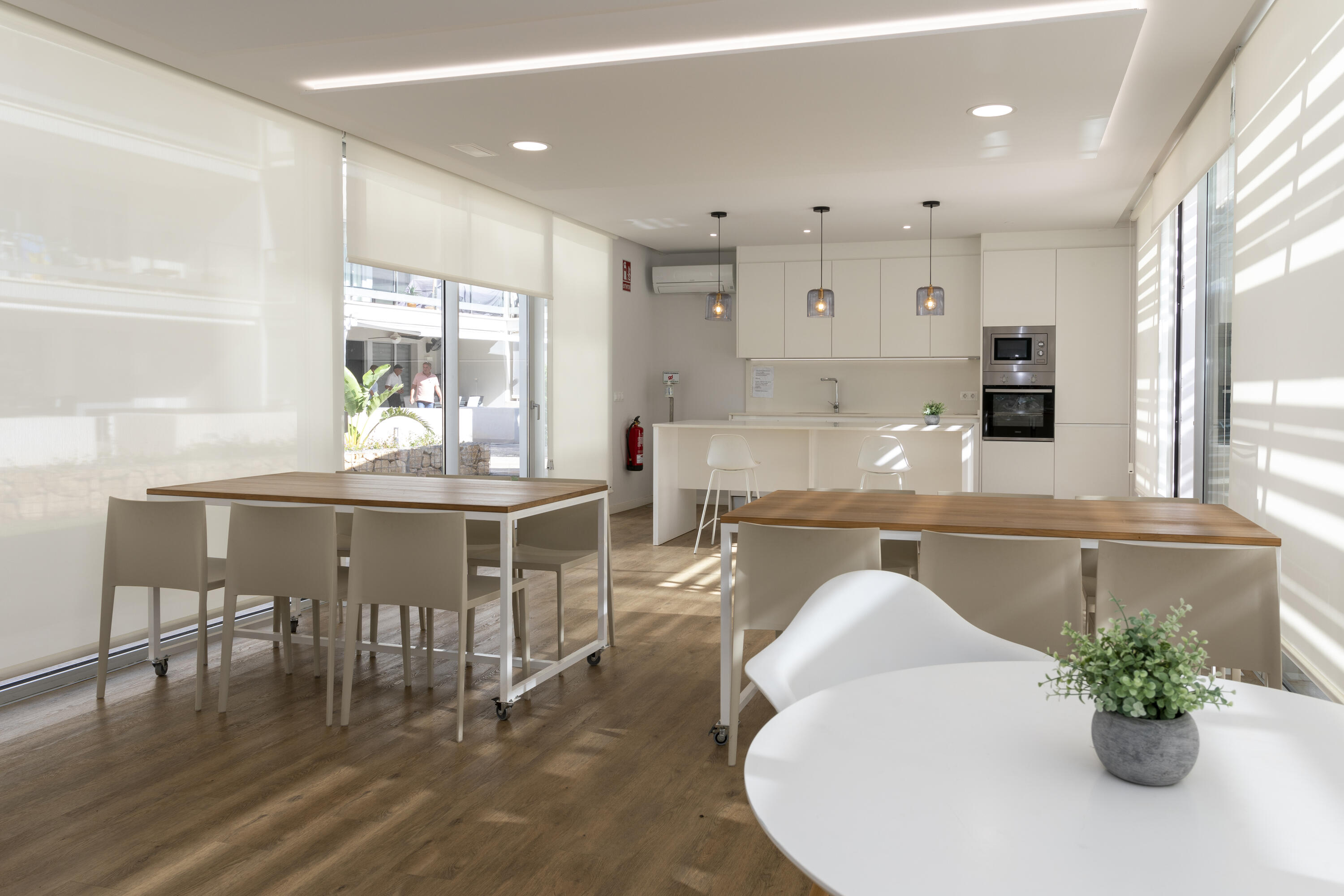 The spacious and bright living-dining room features an open kitchen, fully equipped with modern appliances including a washing machine, dishwasher, microwave, and coffee maker, making it easy to enjoy a complete culinary experience. Relax in the living room while watching the Smart TV or stay connected with Wi-Fi. From the living room, you have access to a private terrace with views of the spectacular communal pool, the perfect spot to relax and enjoy the Mediterranean climate.