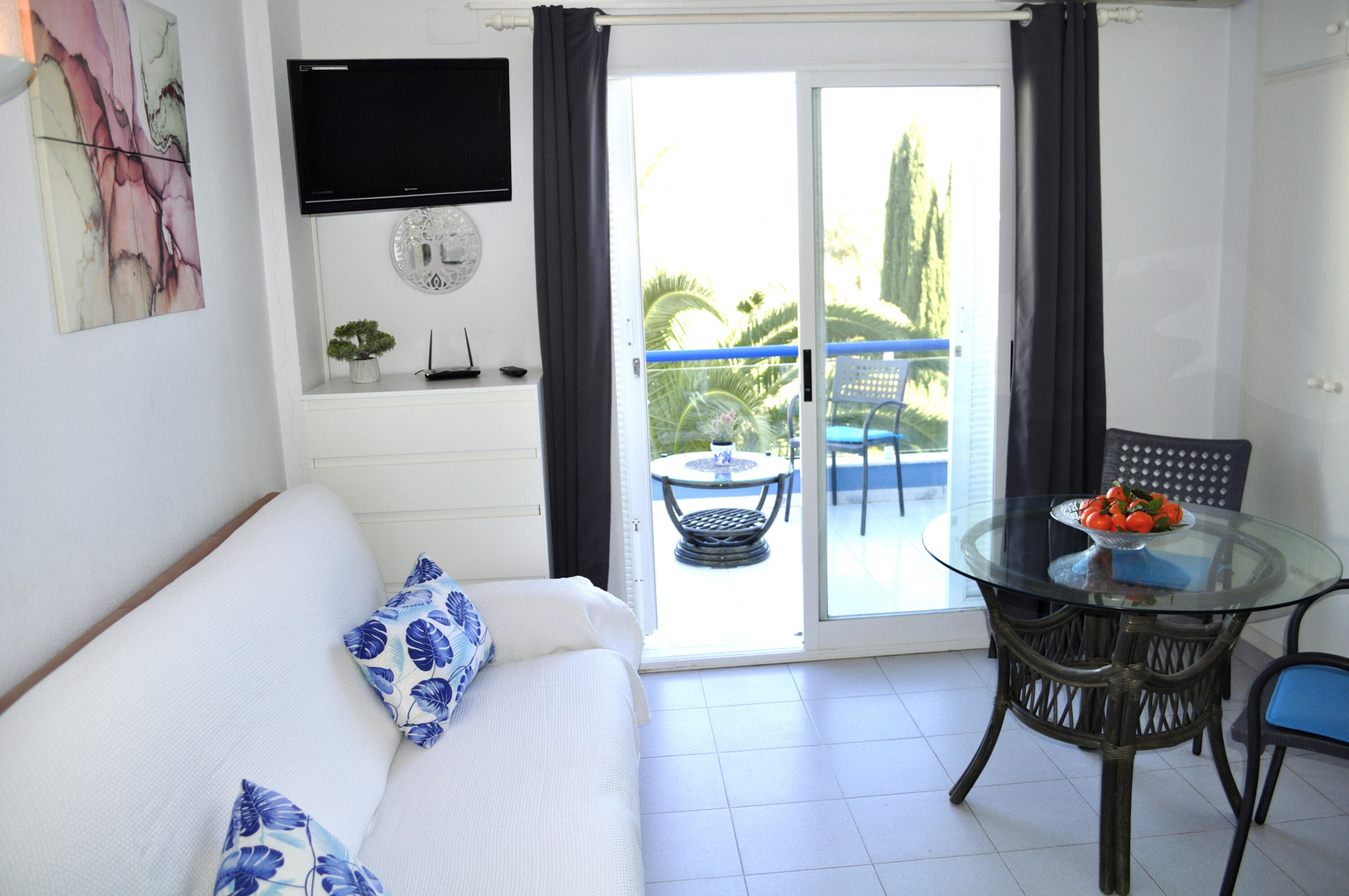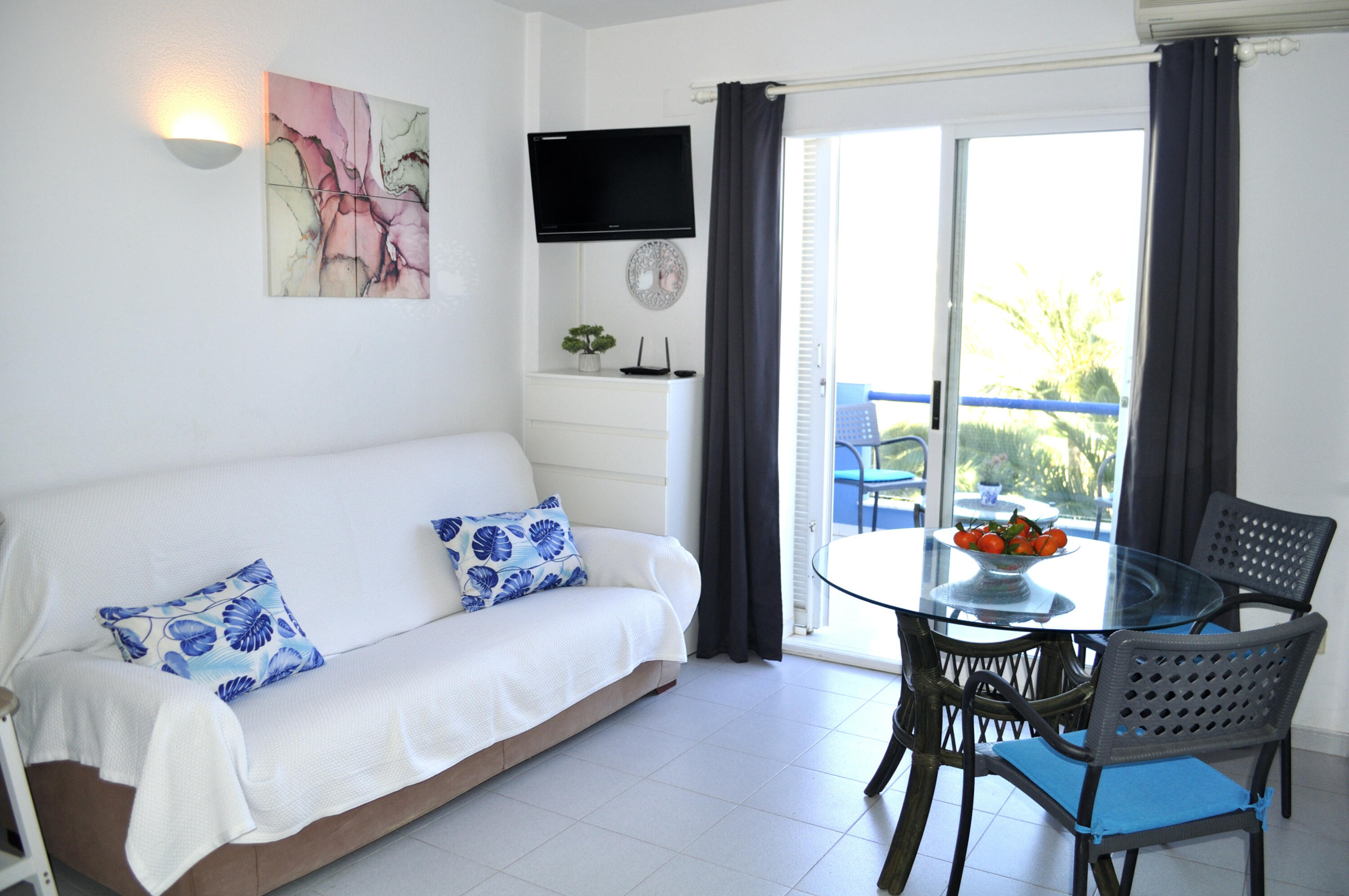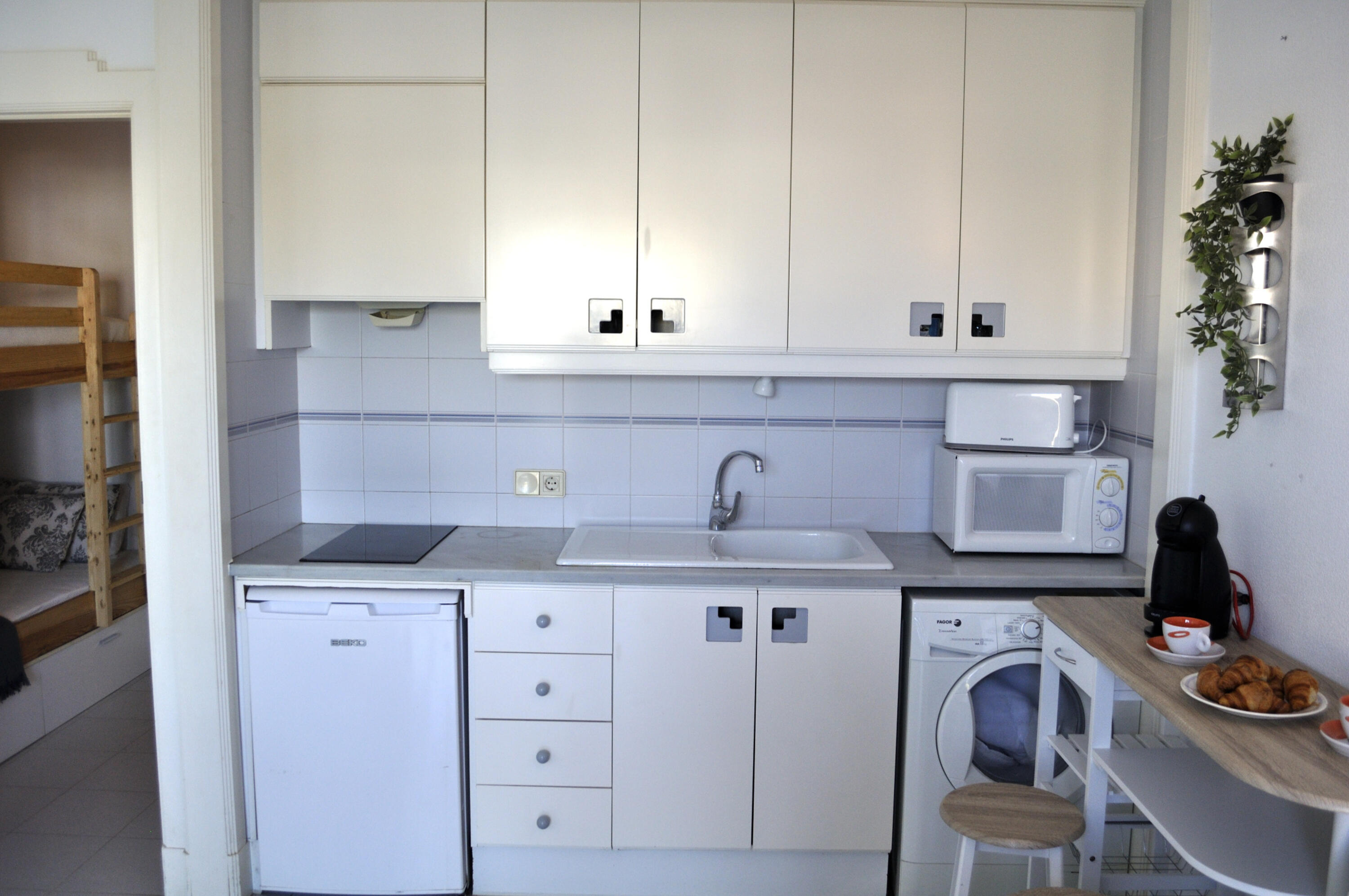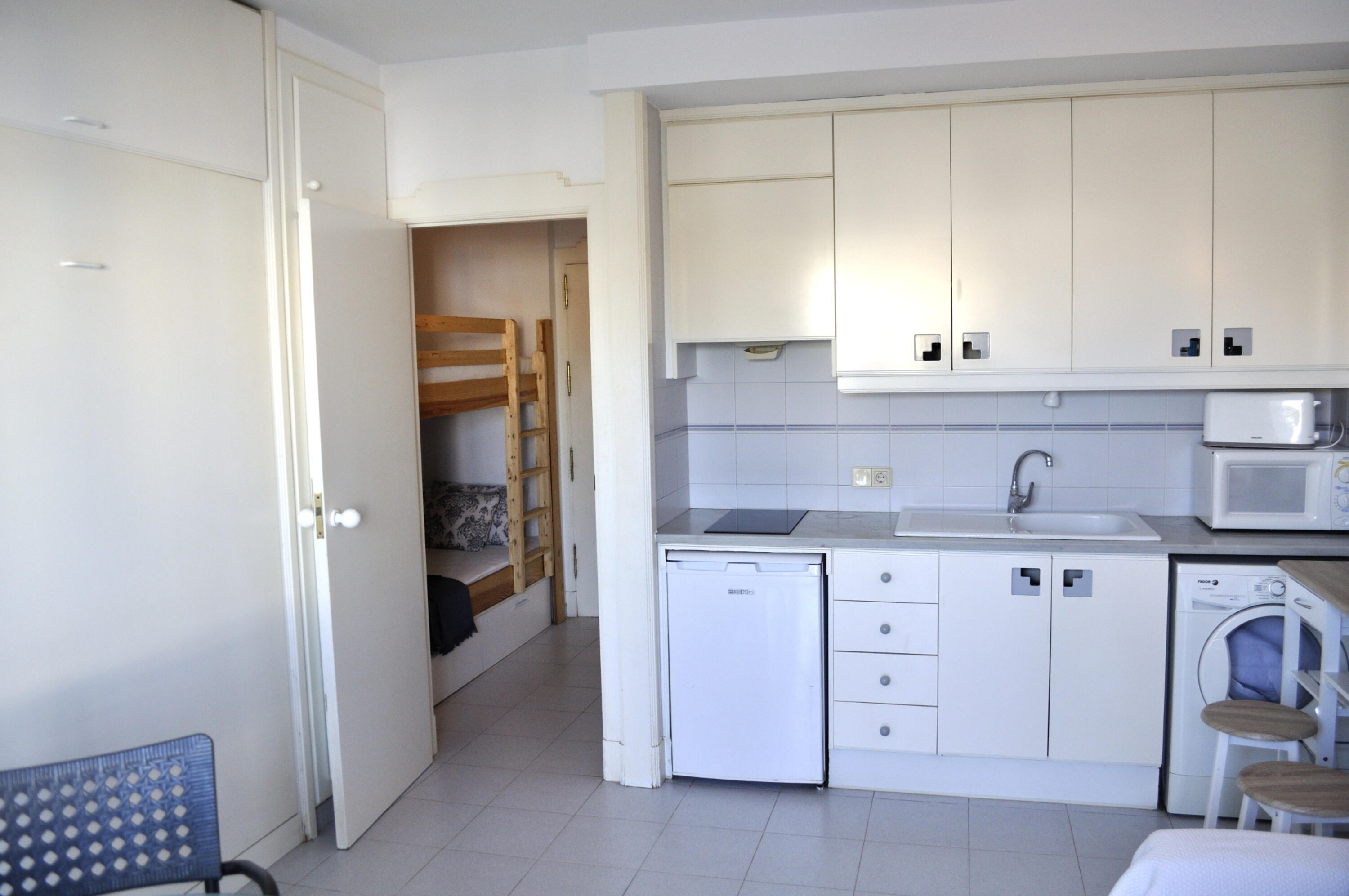 Bright studio on 2nd floor with elevator, and balcony overlooking the communal garden. It consists of a living room with smart TV, open kitchen and equipped. Double bed built into the wall of the living room and bunk beds in the hallway of the entrance to the apartment. Air conditioning in the living room. Bathroom with shower. Free parking space within the urbanization.